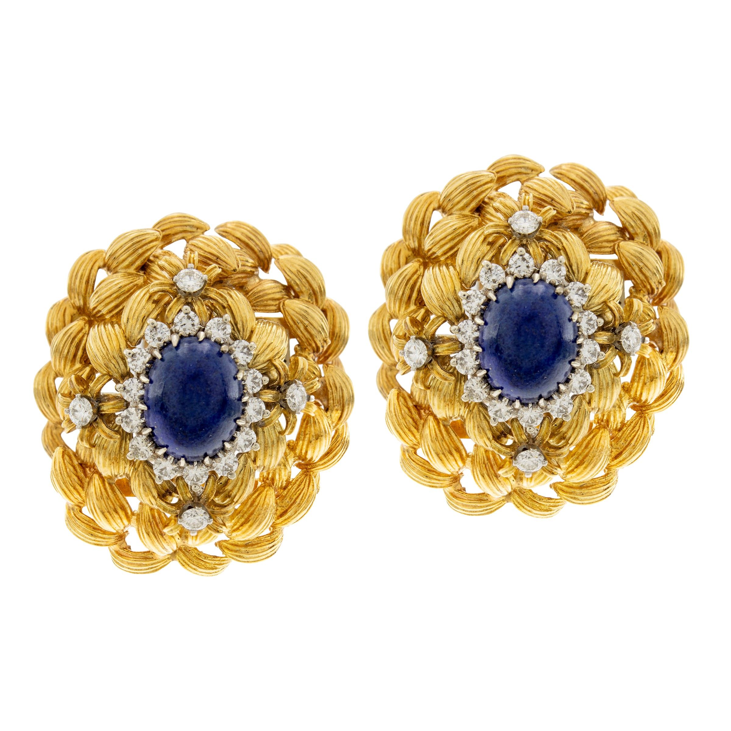 anni 70/80 centrati da lapislazullo taglio cabochon ovale e diamanti taglio brillante ct 0,80 circa incastonati su oro bianco 18kt, dimensioni 3,2x2,7 cm.