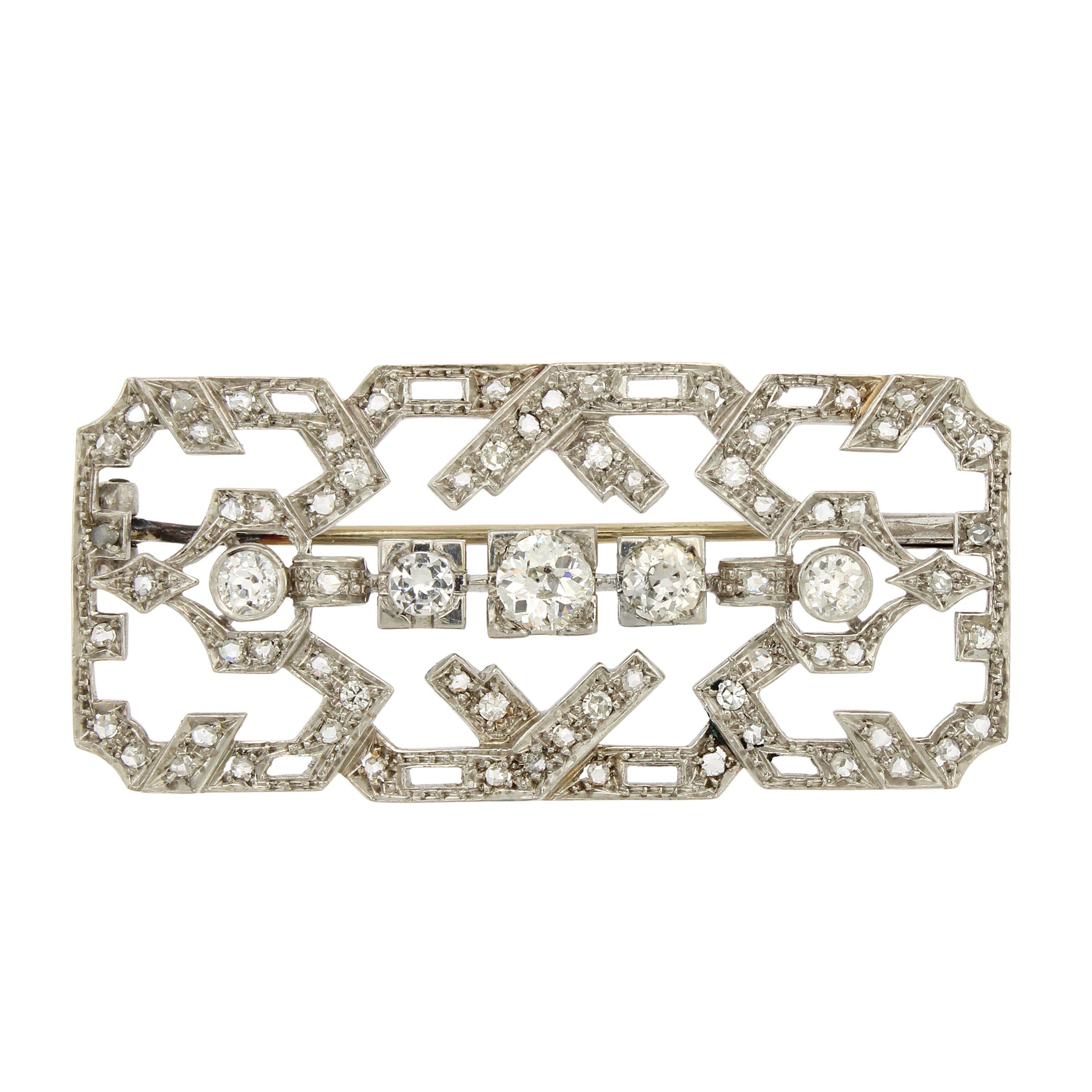 anni 30/40 un diamante ct 0,50 circa, tre diamanti ct 0,60 contornati da rose coroné, dimensioni 6,2x2,5 cm.