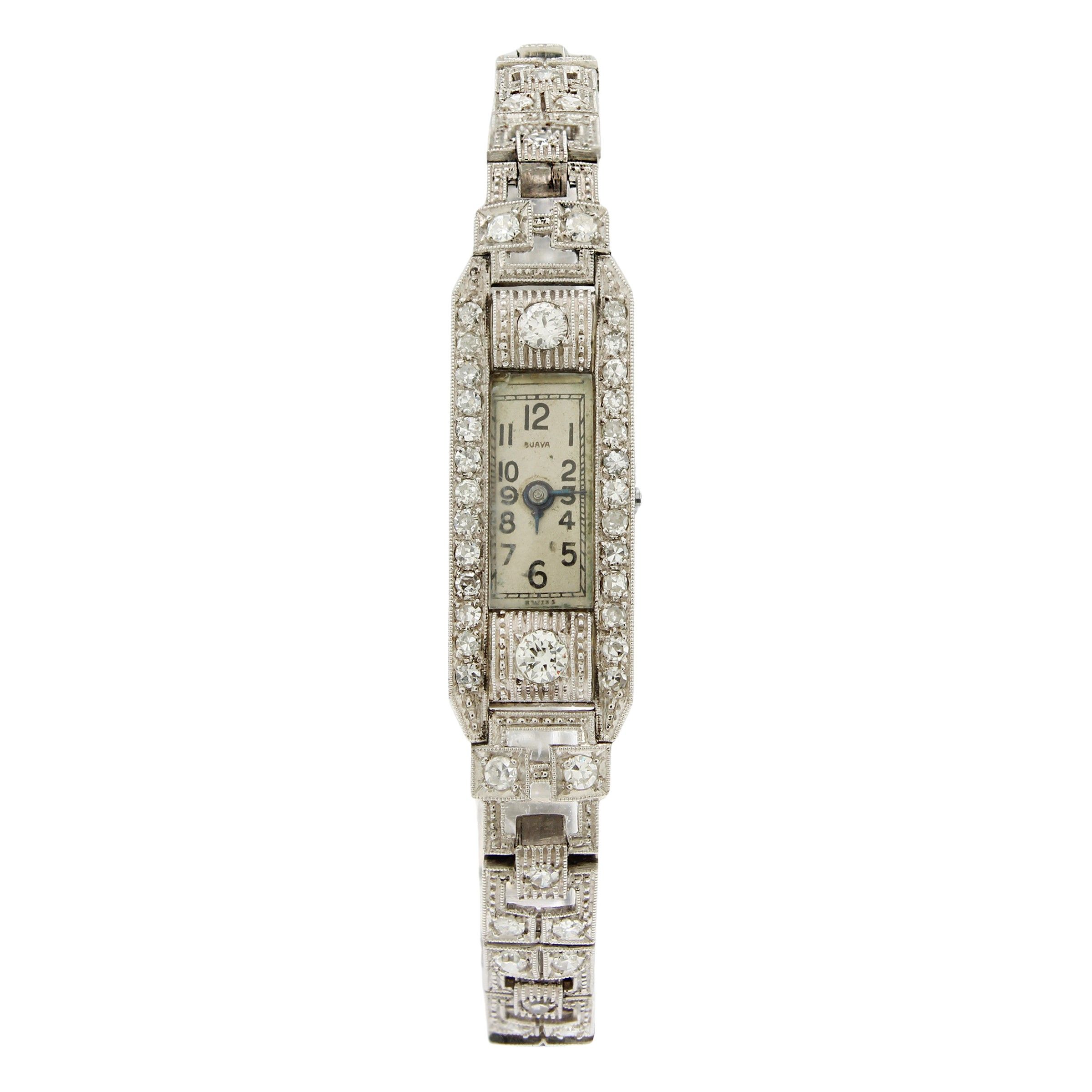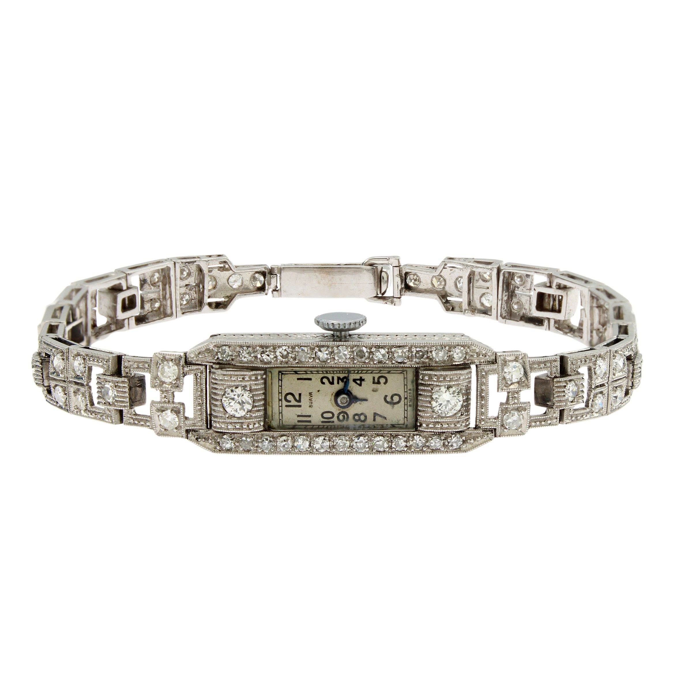 anni 30/40 in platino e diamanti taglio brillante antico ct 2 circa, un brillante mancante, cassa rettangolare 27x10 mm. quadrante argentato con numeri arabi, movimento meccanico a carica manuale, calibro 59, lunghezza 16 cm.