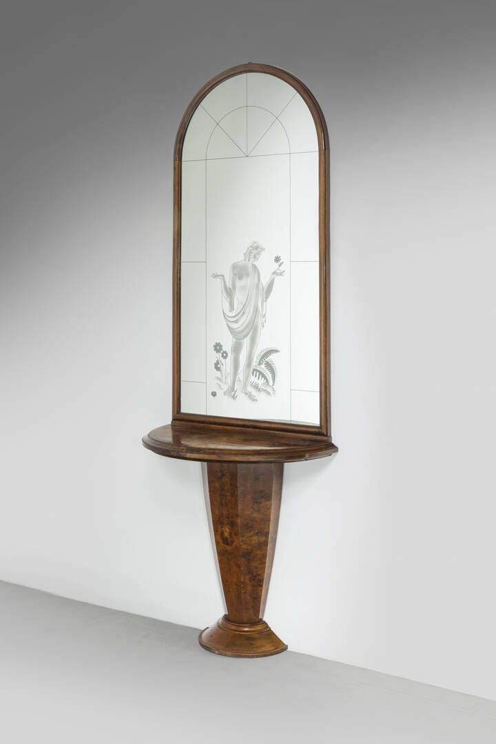 Consolle con specchio in legno e vetro specchiato serigrafato. Anni '40 cm 250x90x40 5 Difetti