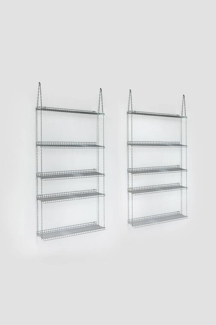 Due catene agganciate a muro fra le quali vengono inserite cinque mensole in rete di acciaio. Prod. Robots anni '70 cm 165x81x18 5 Bibl.: G. Gramigna Repertorio del design italiano 1950-2000 per l'arredamento domestico vol. 1 Allemandi Torino 2003 pag. 206