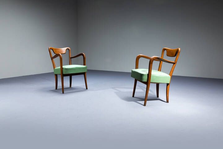 Coppia di poltrone con struttura in legno sedute e schienali imbottiti rivestiti [..]