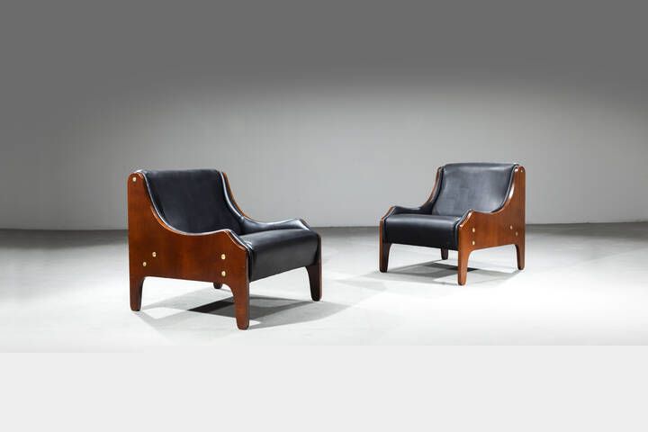 Seduta e schienale imbottite fiancate di contenimento in legno lucidato. Prod. Arflex 1956 cm 78x72x84