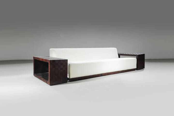 Struttura in legno e cuoio imbottitura rivestita in tessuto. Prod. Bonacina Pier Antonio anni 2000 cm 64x293x100 Difetti