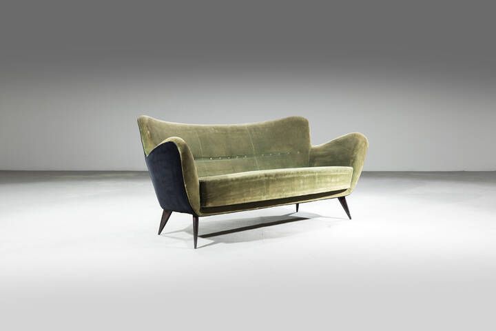 Struttura in legno imbottitura rivestita in tessuto. Anni '50 cm 78x176x74 Difetti