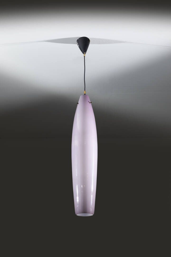 Struttura in metallo verniciato diffusore in vetro colorato e particolari in ottone. Prod. Vistosi anni '60 h cm 120x15