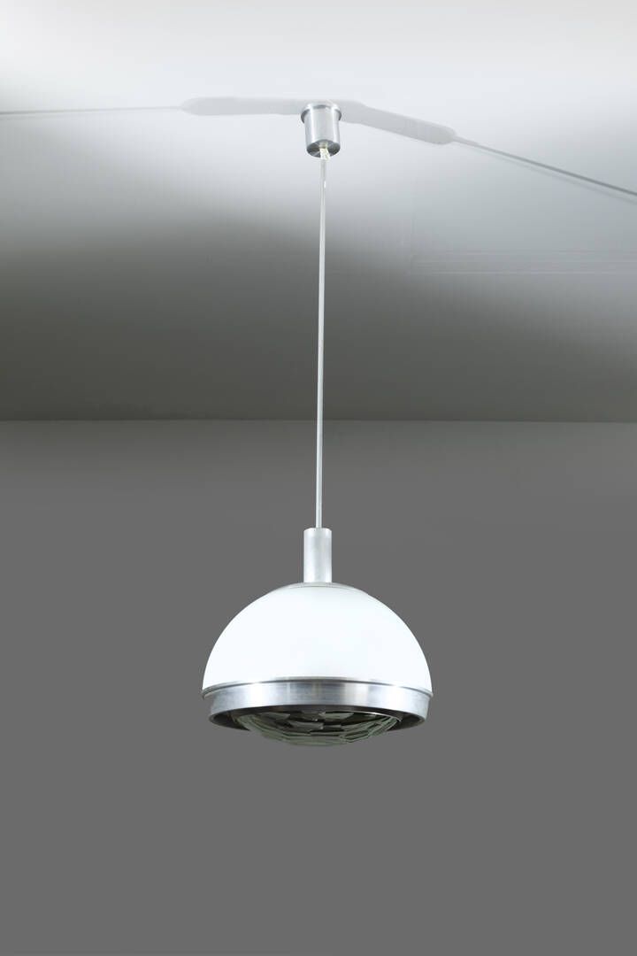 Struttura in vetro opalino e alluminio diffusore in cristallo curvato e satinato. Prod. Lumi anni '60 h cm 125x40