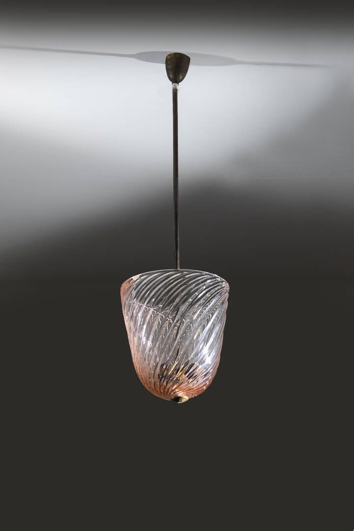 Lampada a sospensione in vetro lavorato a costolature ritorte. Anni '50 h cm 110 [..]