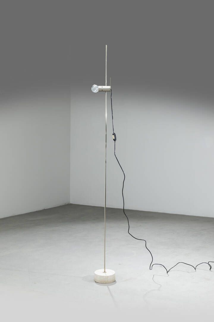 Stelo in acciaio. Base in travertino. Regolabile in altezza Prod. Oluce metà anni '50 h cm 191 5x17 Bibl.: Giuliana Gramigna Repertorio del Design Italinano per l'arredamento domestico 1950-2000 Allemandi 2011 pag. 39