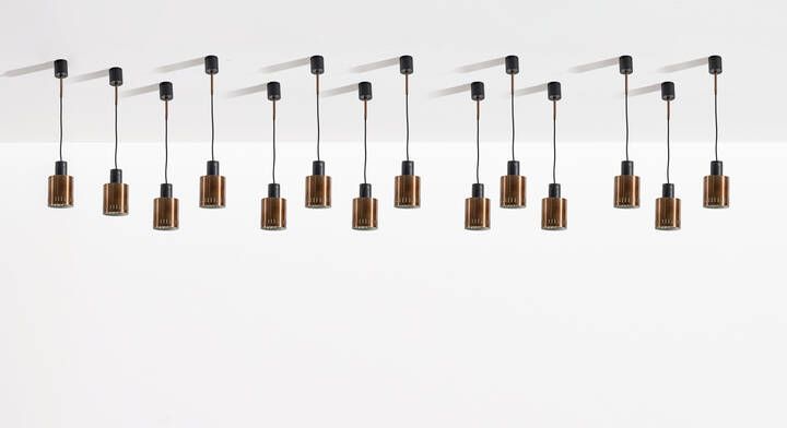 Quattrodici lampade a sospensione in metallo color rame e metallo verniciato. Anni '50 altezza regolabile diffusori h cm 75 5