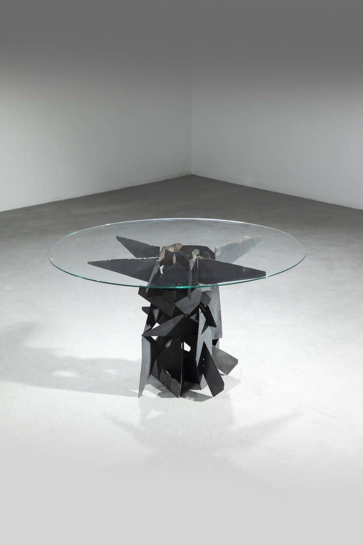 Base in ferro lavorato e piano in vetro. Anni '70 cm 58 5x103 Sbeccatura del piano