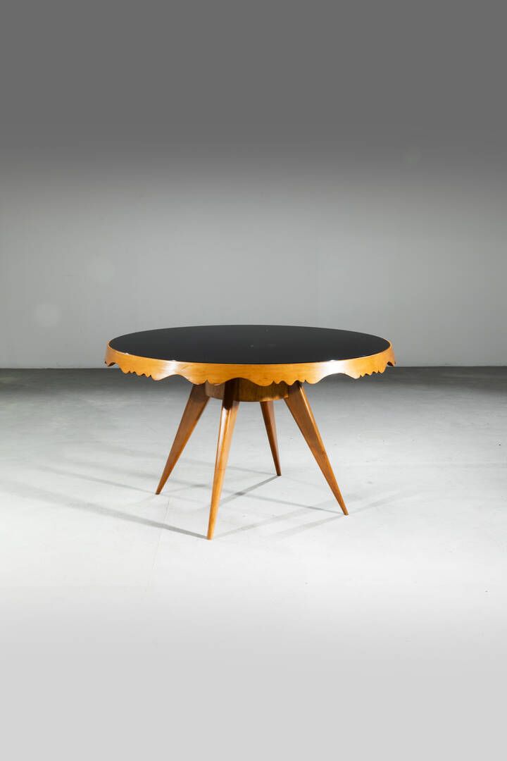 Struttura in legno piano lavorato in legno e vetro nero. Anni '50 cm 79 5x130 Difetti
