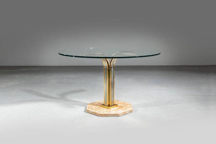 Struttura in ottone e acciaio piano in vetro. Base in marmo Anni '70 cm 77x128x128 Piccole sbeccature
