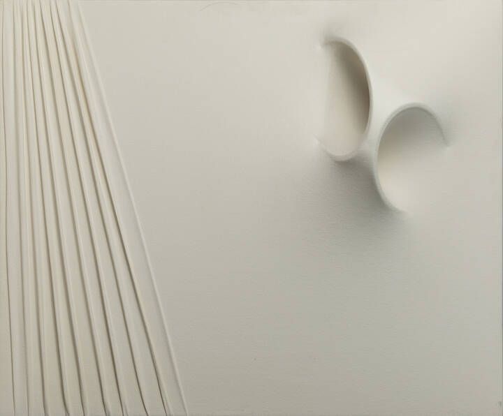 50x60x13 tecnica mista su tela applicata su masonite Opera firmata datata e intitolata al retro con n. di archivio e timbro dell'artista Autentica dell'artista