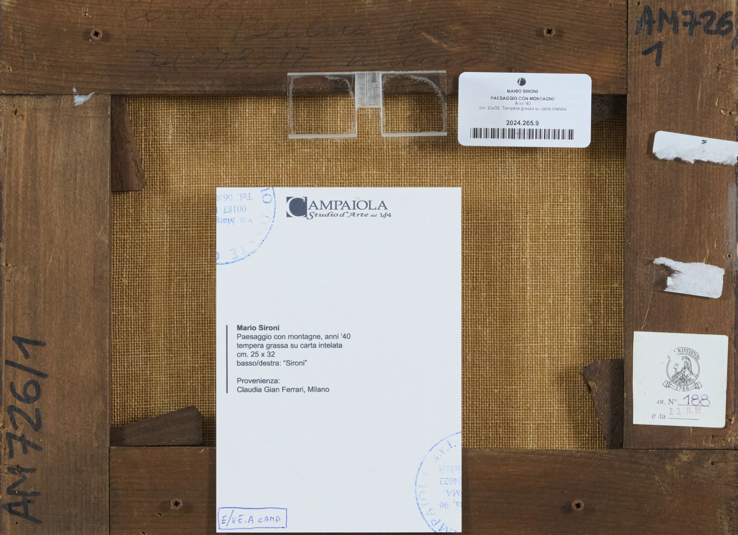Anni '40 Firmato in basso a destra. Sul verso: etichetta e timbri 'Campaiola Studio D'Arte', Roma.