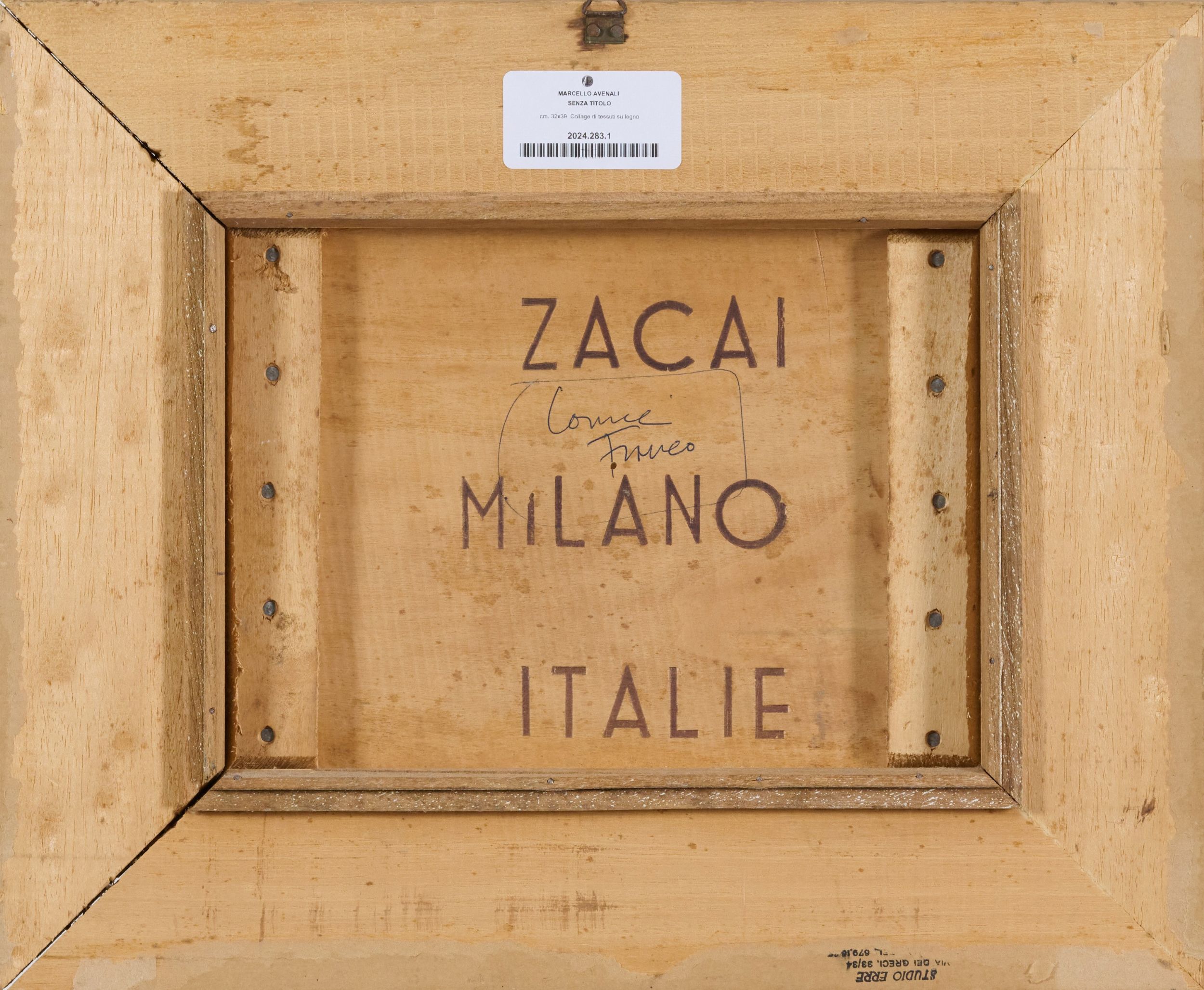 Collage di tessuti e graffette metalliche su legno, cm. 17,5x24