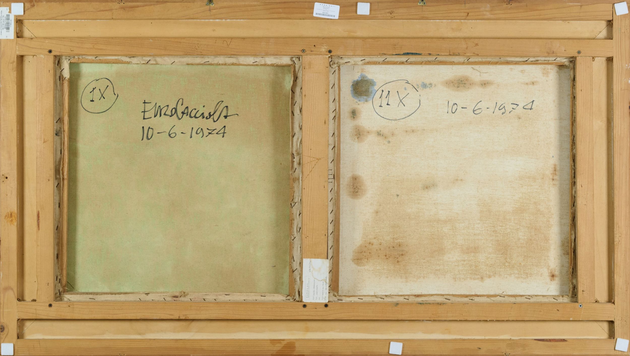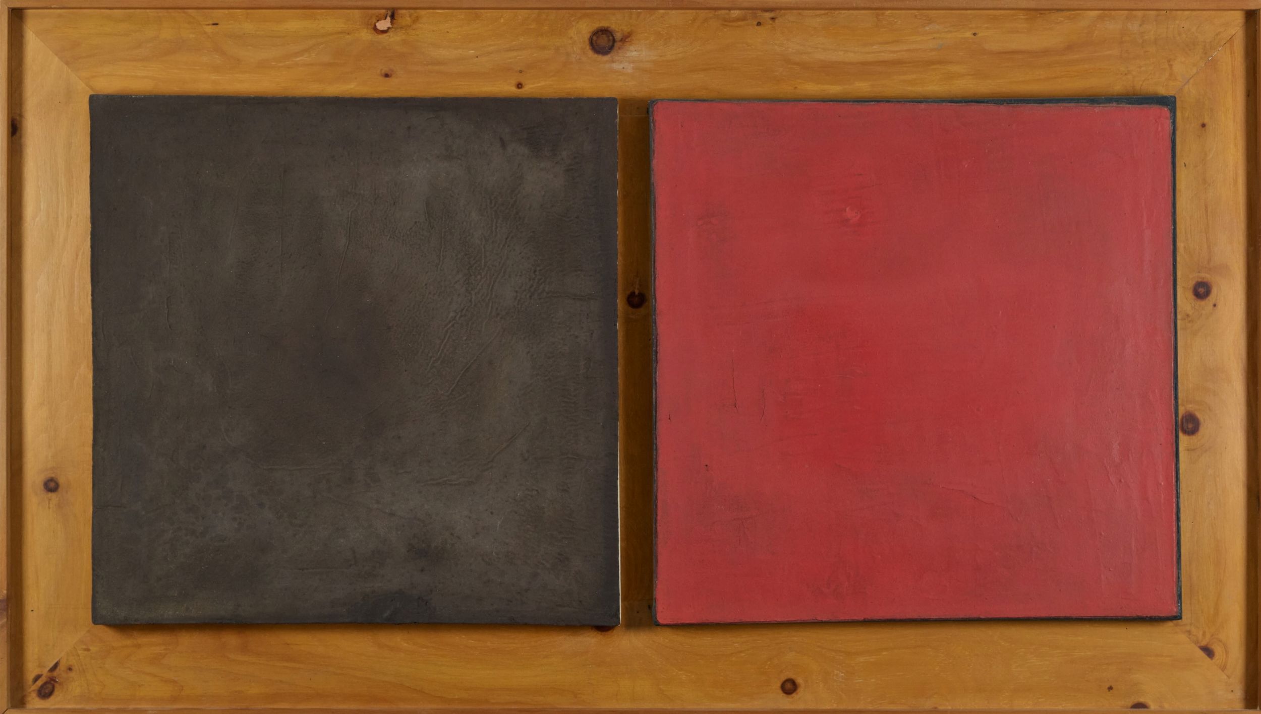 Dittico composto da due elementi di cemento e asbesto su tela di cm. 60x60 cad. una, composizione totale con cornice, cm. 82x145 1974 Sul verso dell'elemento sinistro: firma e data. Sul verso dell'elemento destro: firma. Sul telaio: etichetta 'Katia srl' Genova.