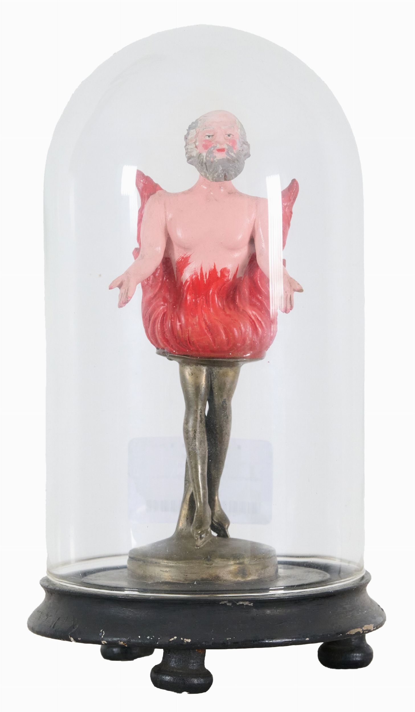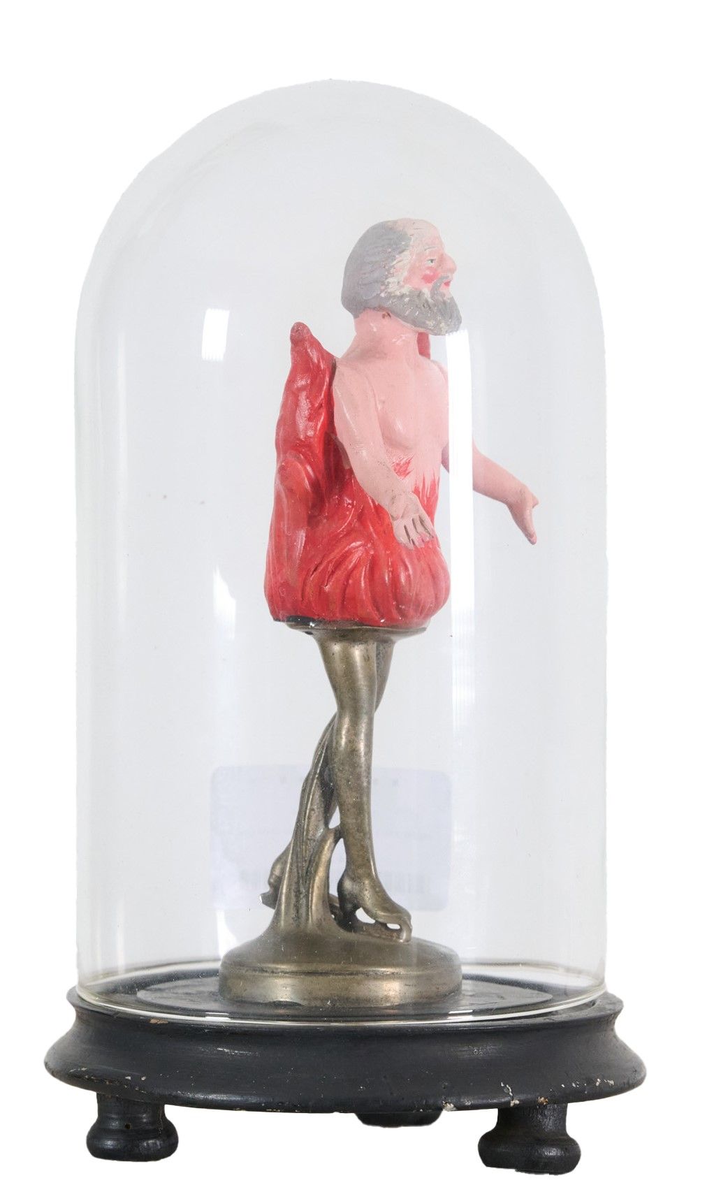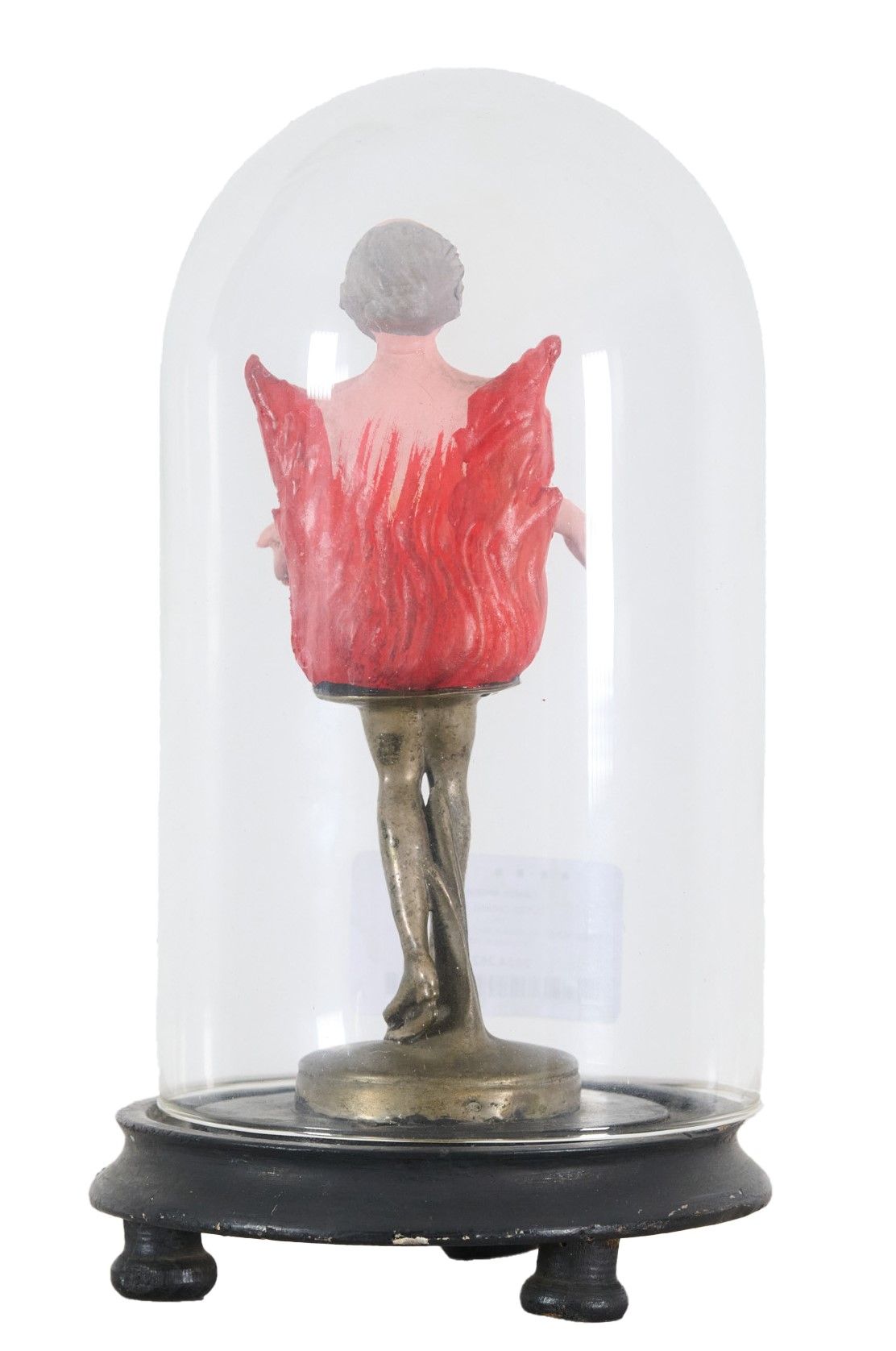 Scultura in ferro e legno dipinta entro campana di vetro., cm. 24x12,5x13