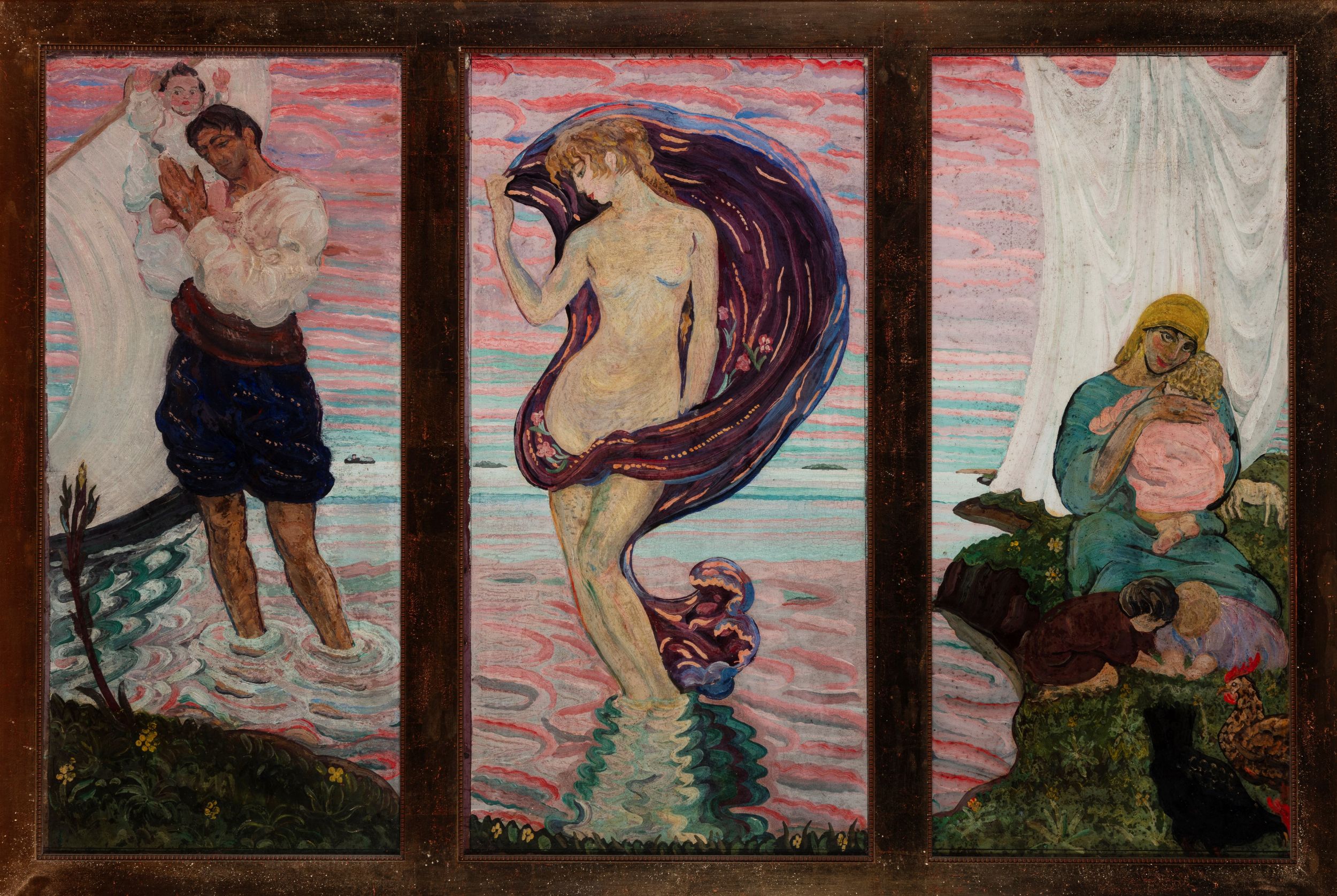tre dipinti, olio su cartone, in un'unica cornice, cm 73 x 33; cm 73 x 37; cm 73 x32