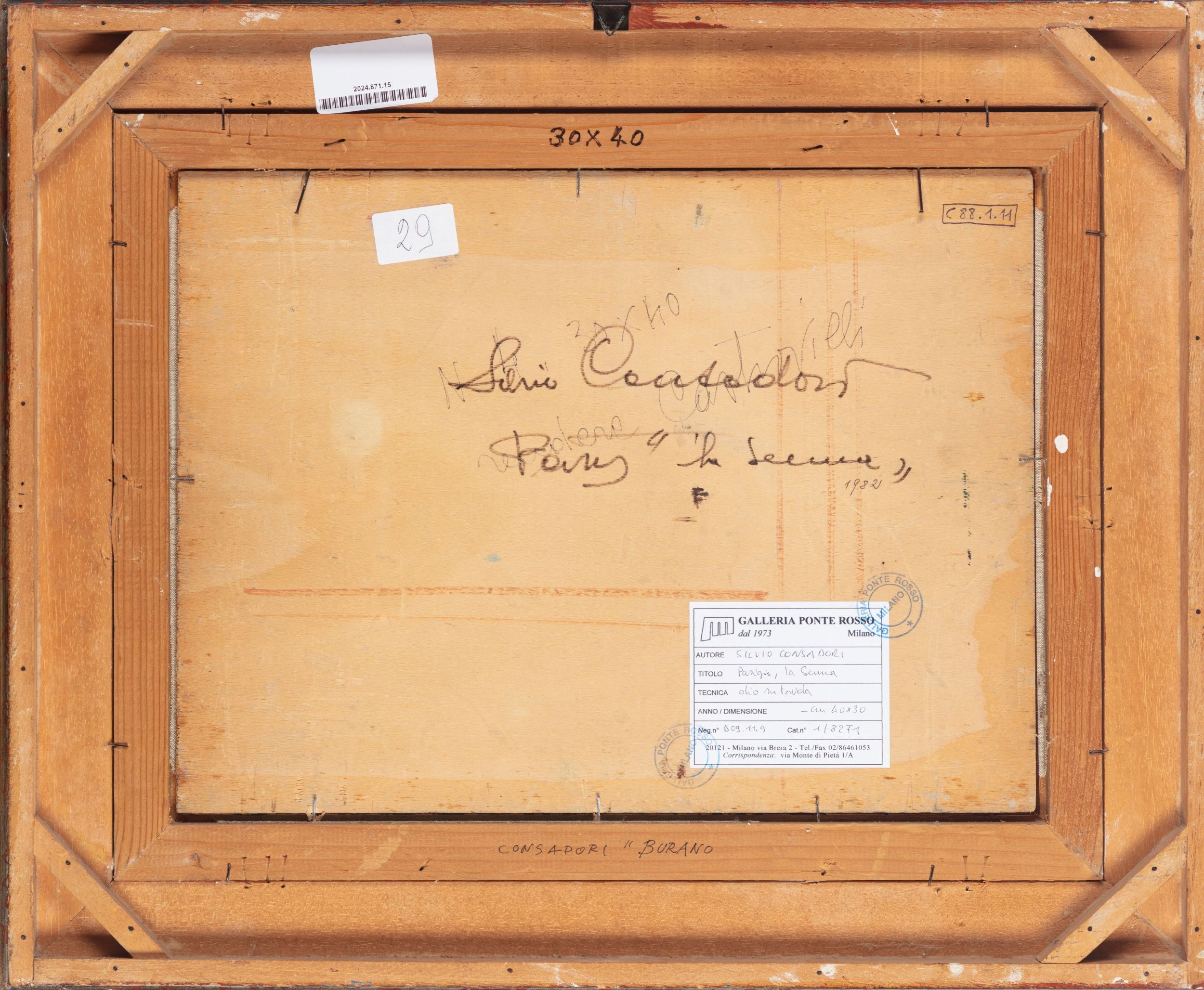 firmato in basso a destra: CONSADORI al retro, sulla tavola, firmato e titolato; timbri ed etichetta della Galleria Ponte Rosso di Milano