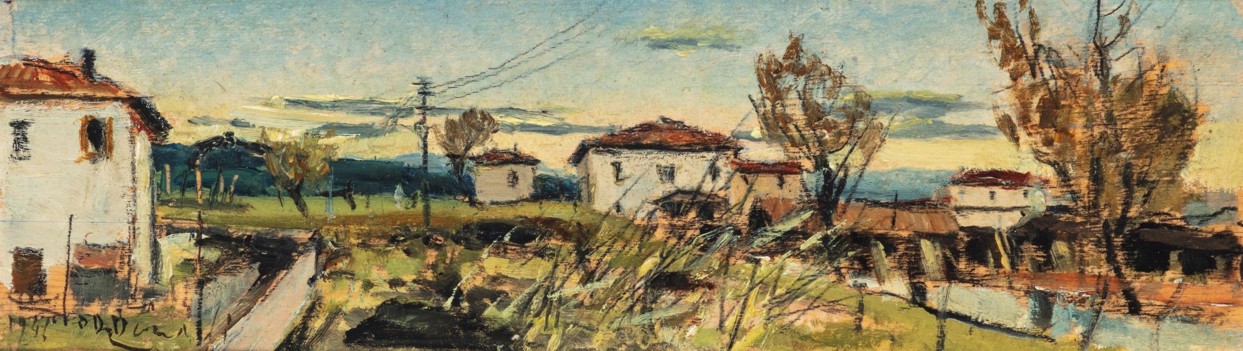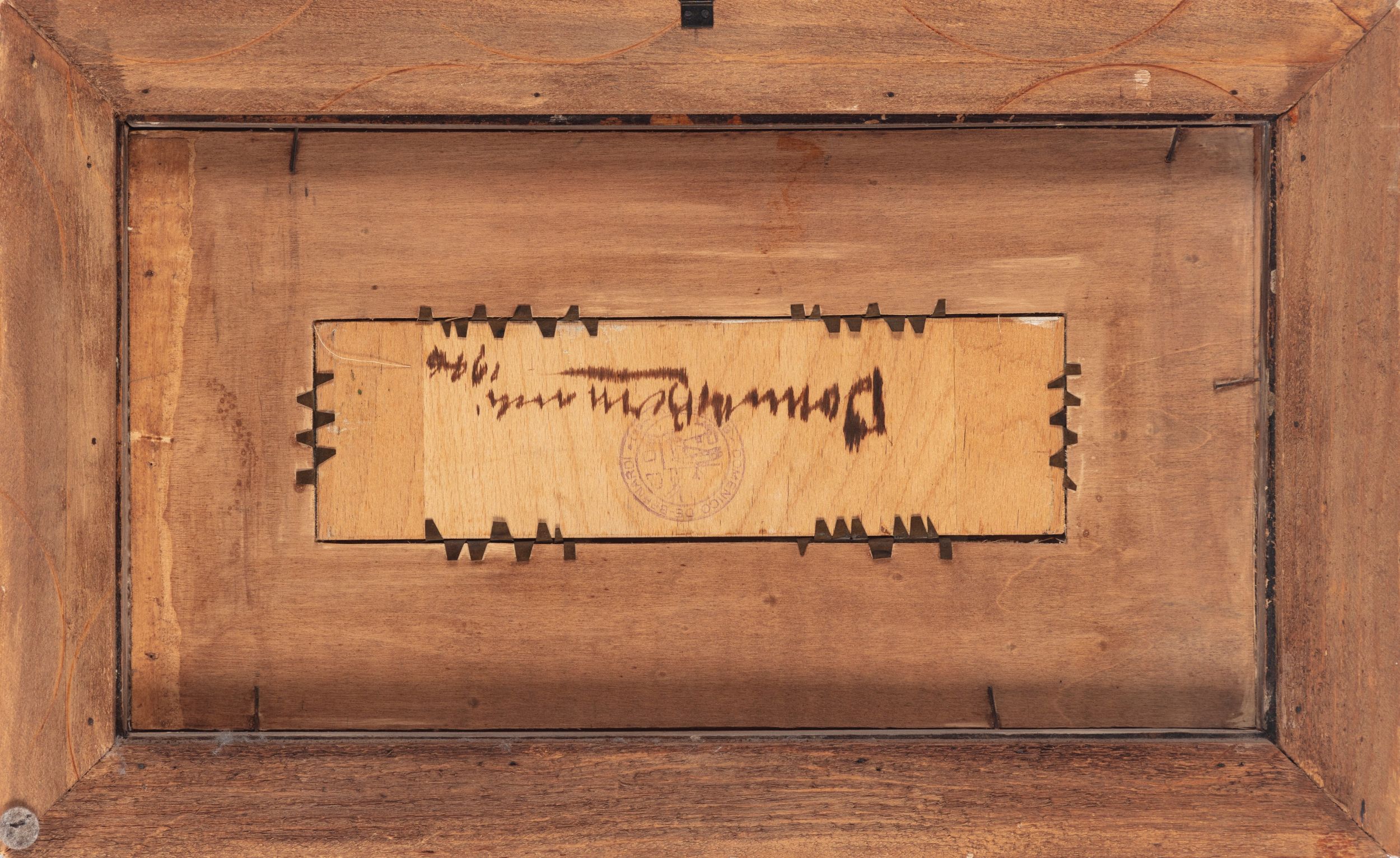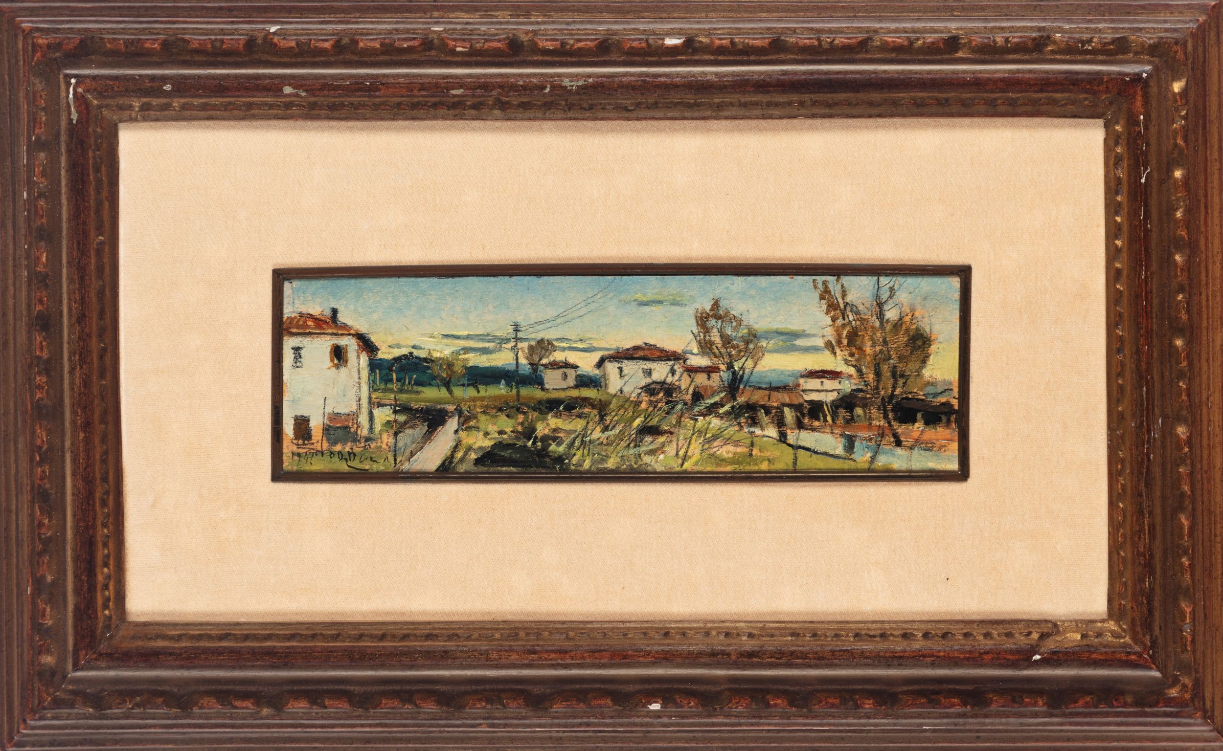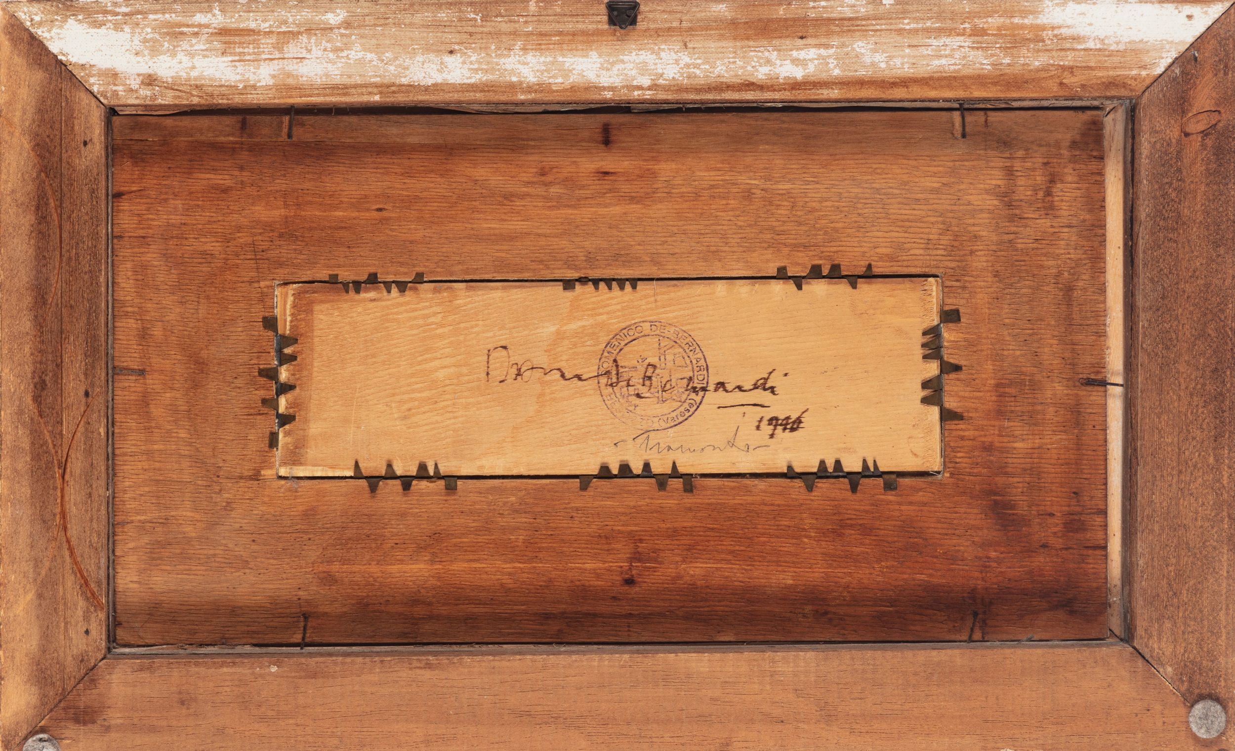 coppia, olio su compensato, cm 7,5 x 24 ciascuno 1946 il Mattino firmato in basso a sinistra: D. De Bernardi ; al retro, firmato e datato Domenico De Bernardi 1946 e timbro del pittore il Tramonto firmato e datato in basso a sinistra: 1946 D. De Bernardi ; al retro firmato, datato e titolato, e timbro del pittore
