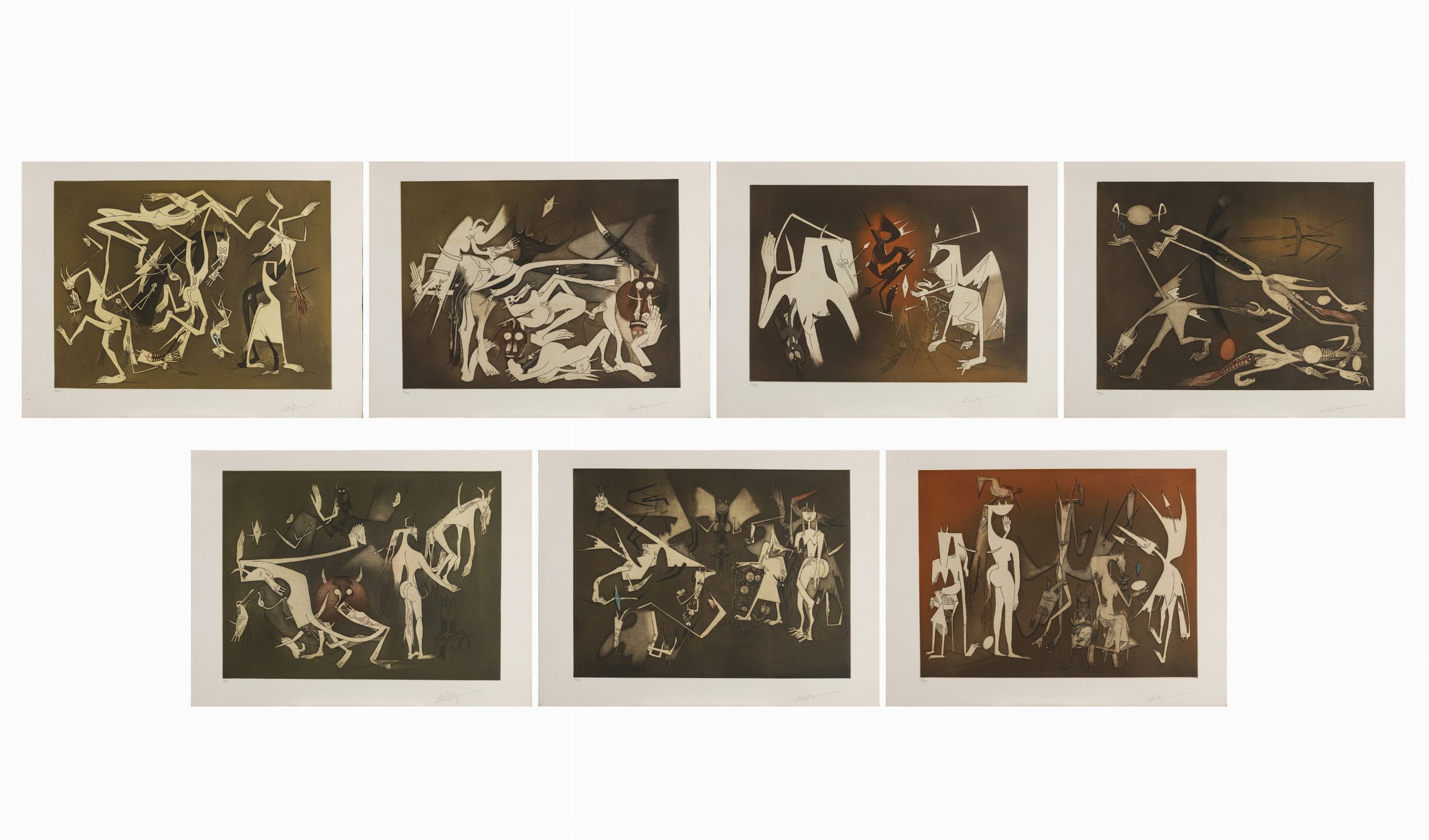 cartella completa di 07 acqueforti, ess. 64/125, cm 45 x 65 ca (misure di ciascuna lastra); cm 60 x 50 ca (misure di ciascun foglio) 1969-1971 Firma a matita in basso a destra su ciascun foglio Da un'edizione di 155 esemplari: 30 esemplari in numeri romani da I a XXX 125 esemplari numerati da 1 a 125 Editore Grafica uno - Giorgio Upiglio, Milano