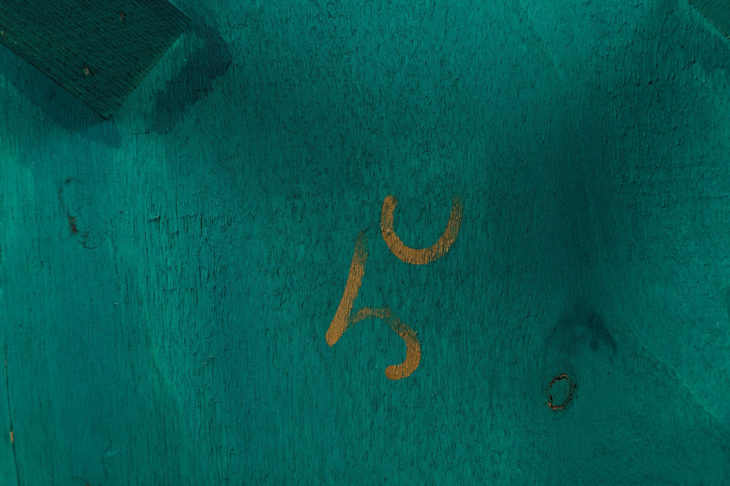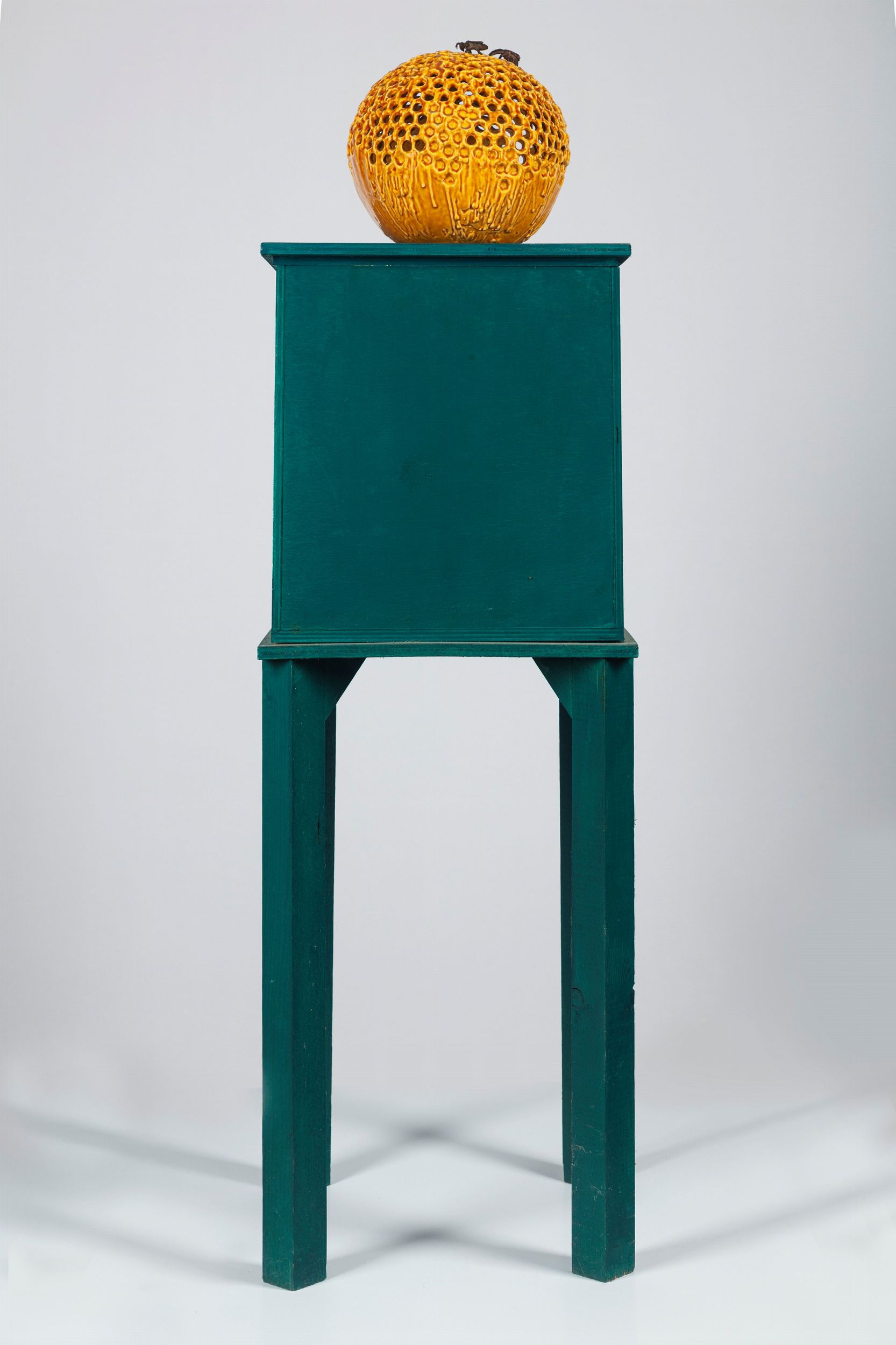 legno dipinto, ceramica e bronzo, es. 28/50, cm 77,5 x 29,5 (misure del legno) ; diam. cm 19 ca. (sfera in ceramica)