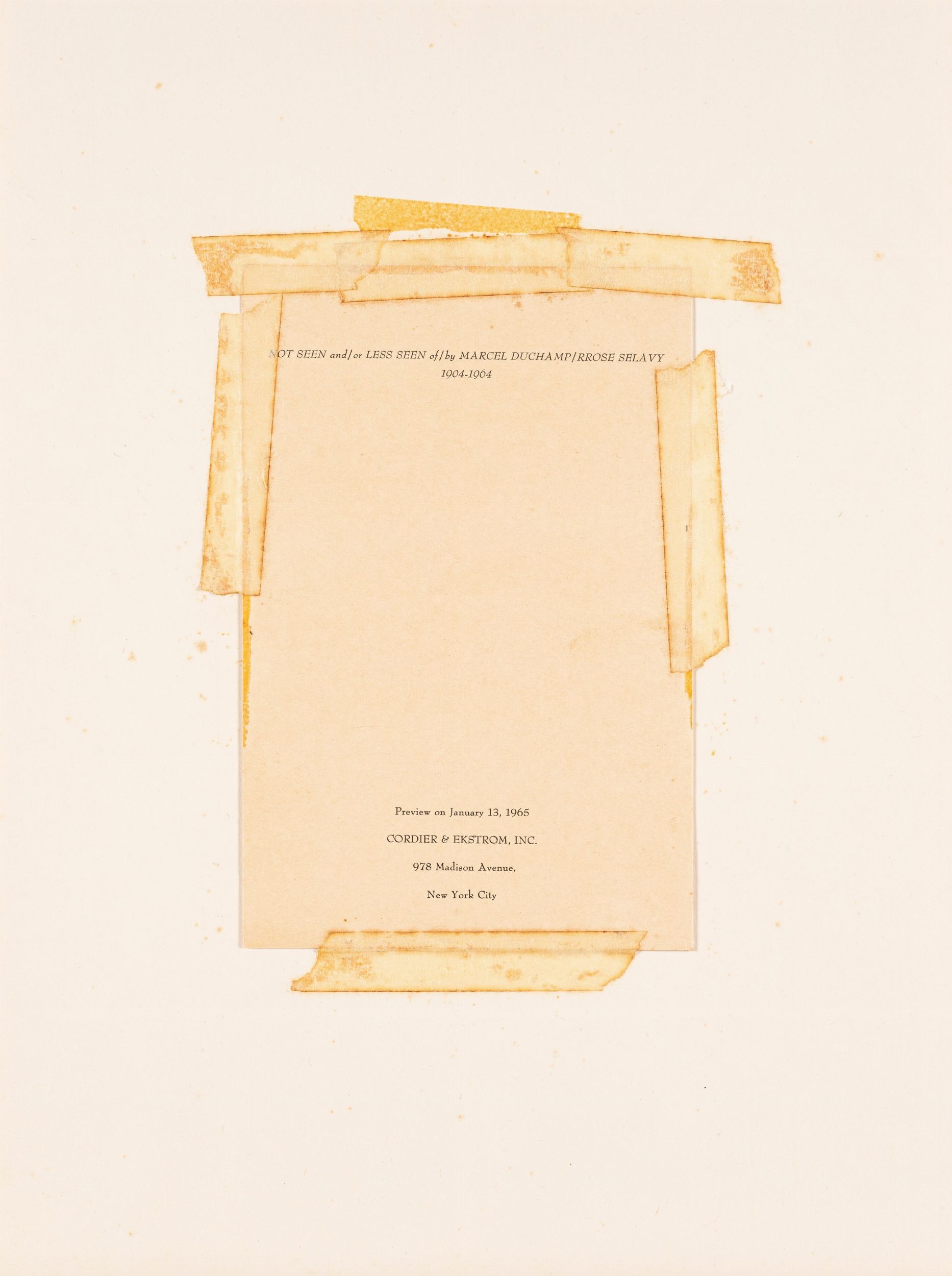 tecnica mista (riproduzione della Monna Lisa su carta da gioco montata su invito), cm 21 x 14 (misure dell'invito) ; cm 8,8 x 6,2 (misure della carta da gioco) 1965 Titolato al centro: rasée L.H.O.O.Q. Firmato in basso a destra: Marcel Duchamp Readymade realizzato per la cena tenutasi il 13 gennaio 1965 in occasione della preview della mostra NOT SEEN and/or LESS SEEN of/by MARCEL DUCHAMP/RROSE SELAVY, 1904-1964:The Mary Sisler Collection, New York, Cordier & Ekstrom INC., 14 gennaio-13 Febbraio 1965. Per la preview sono stati realizzati circa 100 inviti.