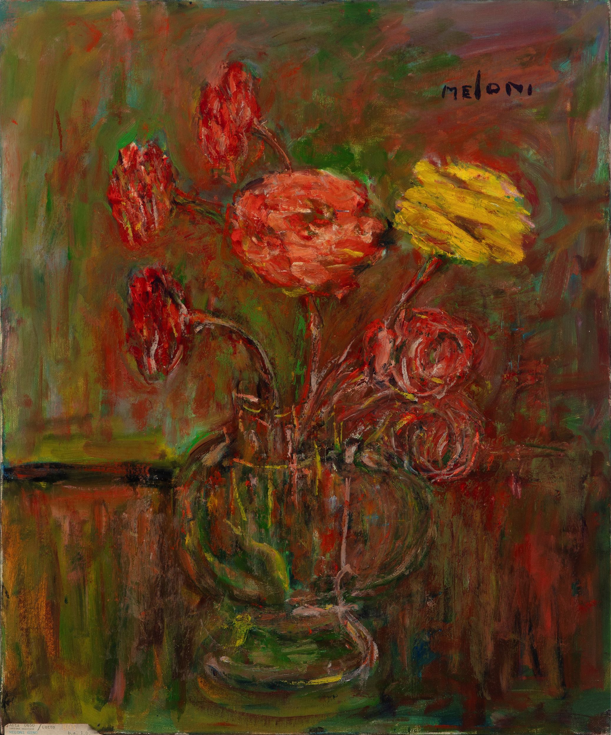 1986 Firmato in alto a destra: Meloni Titolato, firmato e datato al verso: Rose nel vaso, Meloni 86