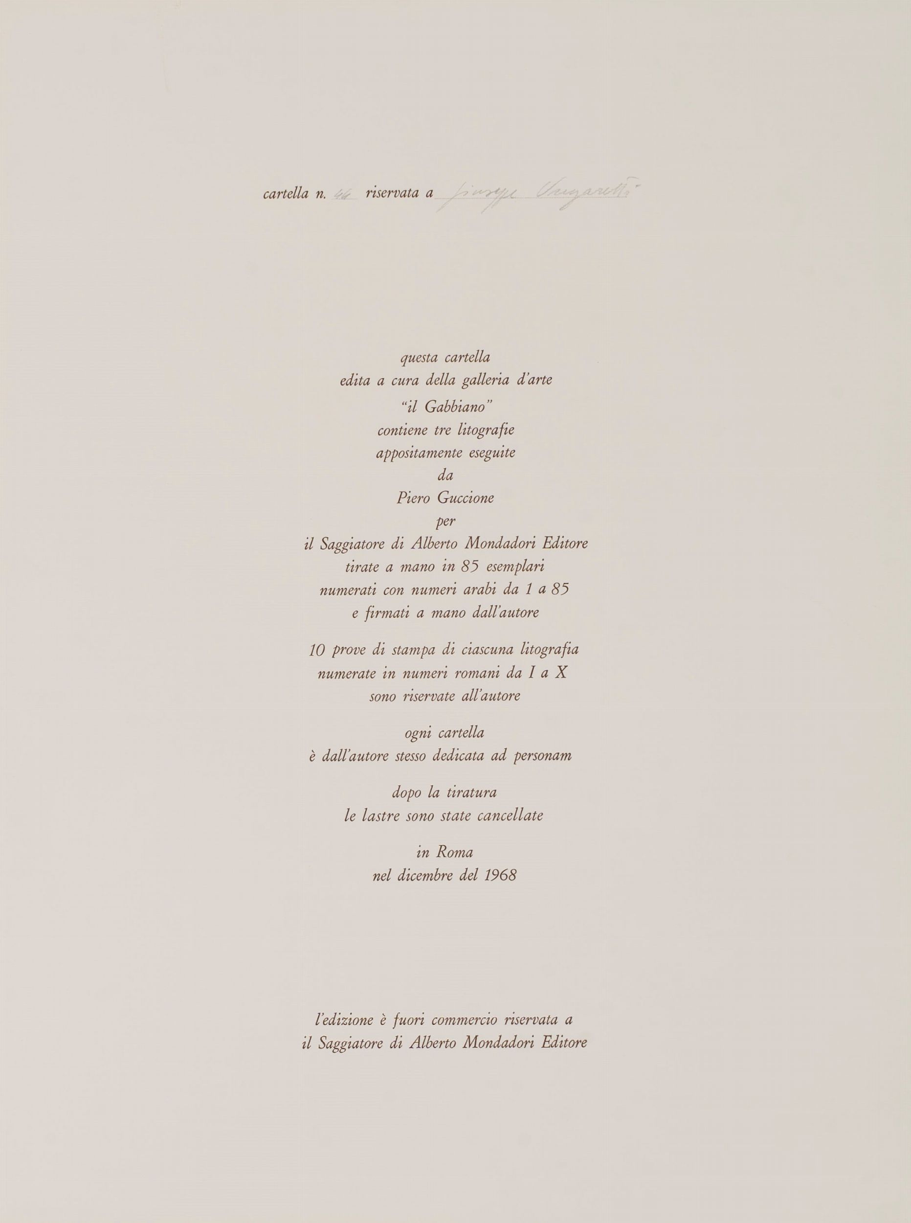 cartella contenente 3 litografie a colori, ess. 44/85, cm 60 x 45,5 (misure di ciascun foglio), (sc) 1968 Tutte firmate e datate a matita in basso a destra Ogni cartella dedicata dall'Autore ad personam, la nostra è dedicata a Giuseppe Ungaretti Editore Galleria Il Gabbiano, Roma per Il Saggiatore di Alberto Mondadori Entro custodia originale in cartone telato giallo