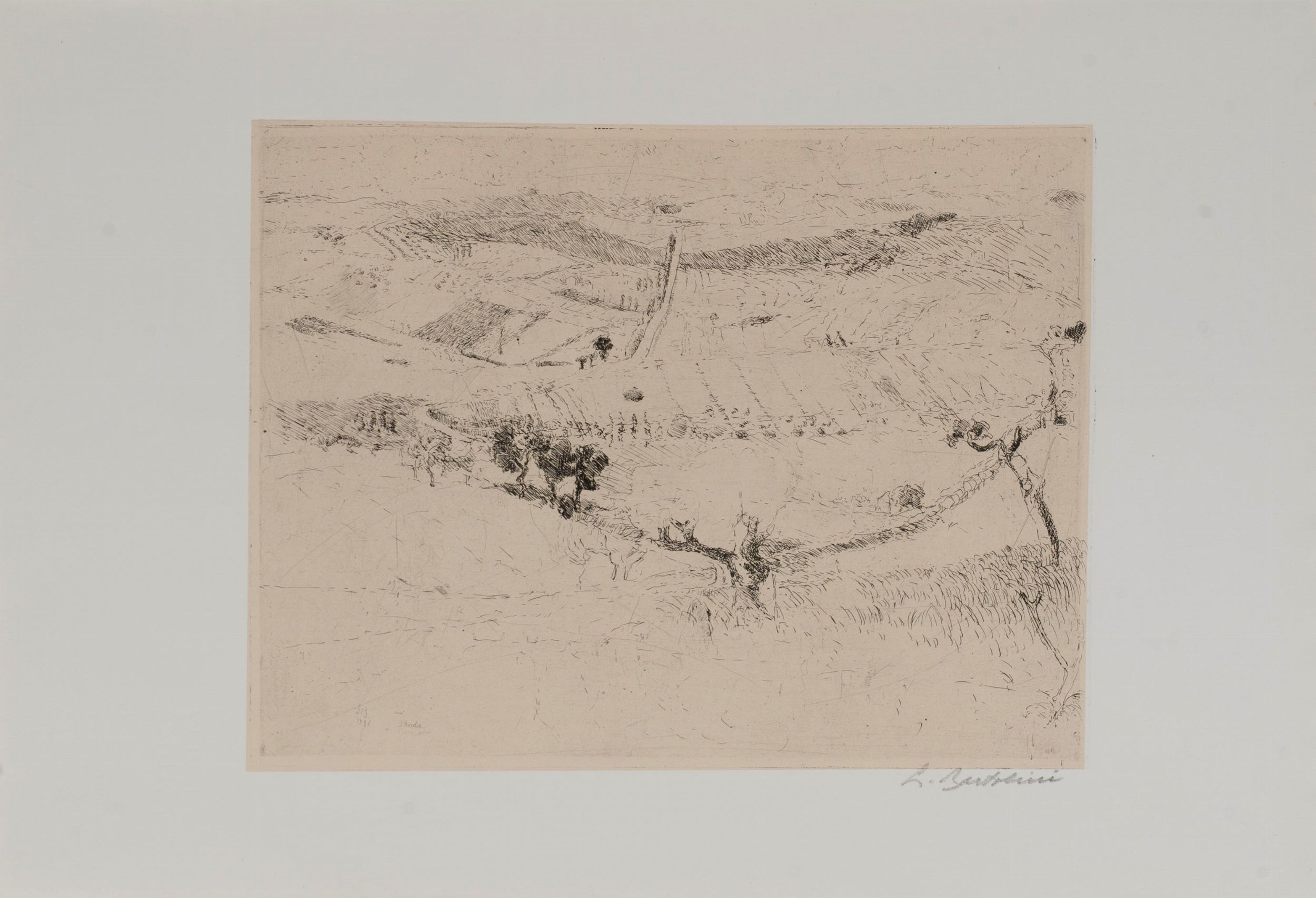 cartella contenente 5 poesie di Giacomo Leopardi e 2 incisioni all'acquaforte non numerate ma facent 1962 a) La strada d'Ancona acquaforte, cm 25,5 x 32,8 (36 x 52 misure del foglio), (sc) Firma a matita in basso a destra Titolo e data 1931 nella lastra b) La finestra del solitario acquaforte, cm 20 x 16 (36 x 52 misure del foglio), (sc) Firma a matita in basso a destra Firma in basso a destra nella lastra Editore Bucciarelli, Ancona Entro custodia originale in cartoncino beige
