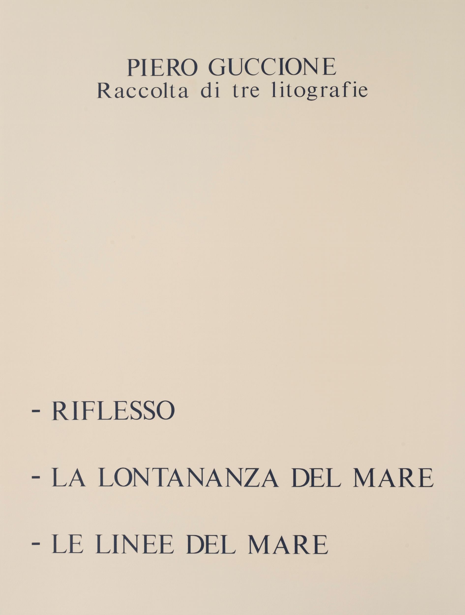 litografie a colori, ess. 34/100, cm 59 x 77 (misure di ciascun foglio), (sc) 1992 a) Riflesso b) La lontananza del mare c) Le linee del mare Tutte firmate a matita in basso a destra Tutte recanti in basso a sinistra il timbro a secco delle Edizioni Torcular, Milano In basso a destra timbro a secco dell'Atelier dell'Autore Entro custodia originale in cartone telato azzurro