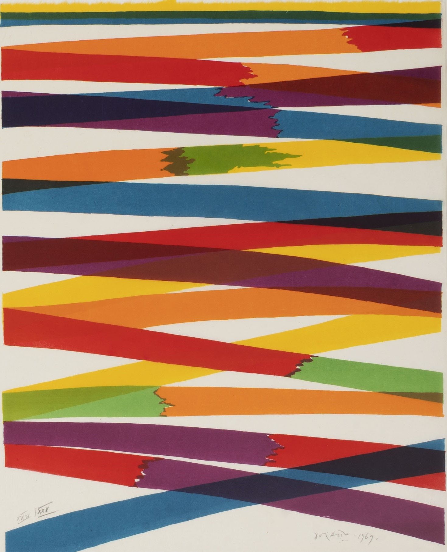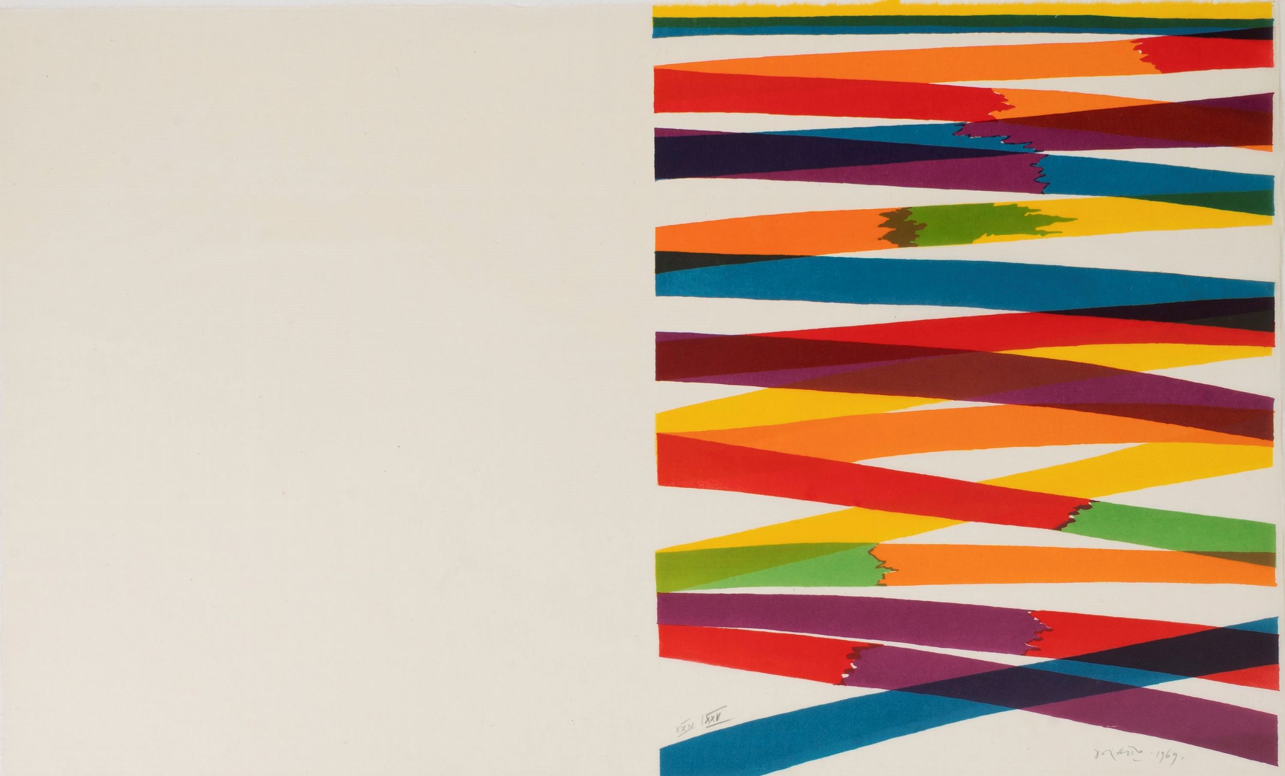 cartella contenente 11 litografie a colori (su 13) su carta Japon e poesie di Giuseppe Ungaretti, es, cm 54 x 90 (misure del foglio), (sc) 1970/'71 Tutte firmate a matita, alcune datate 1970, una datata 1969 Editore e Stampatore Erker Presse, St. Gallen Entro custodia originale in cartone telato verde