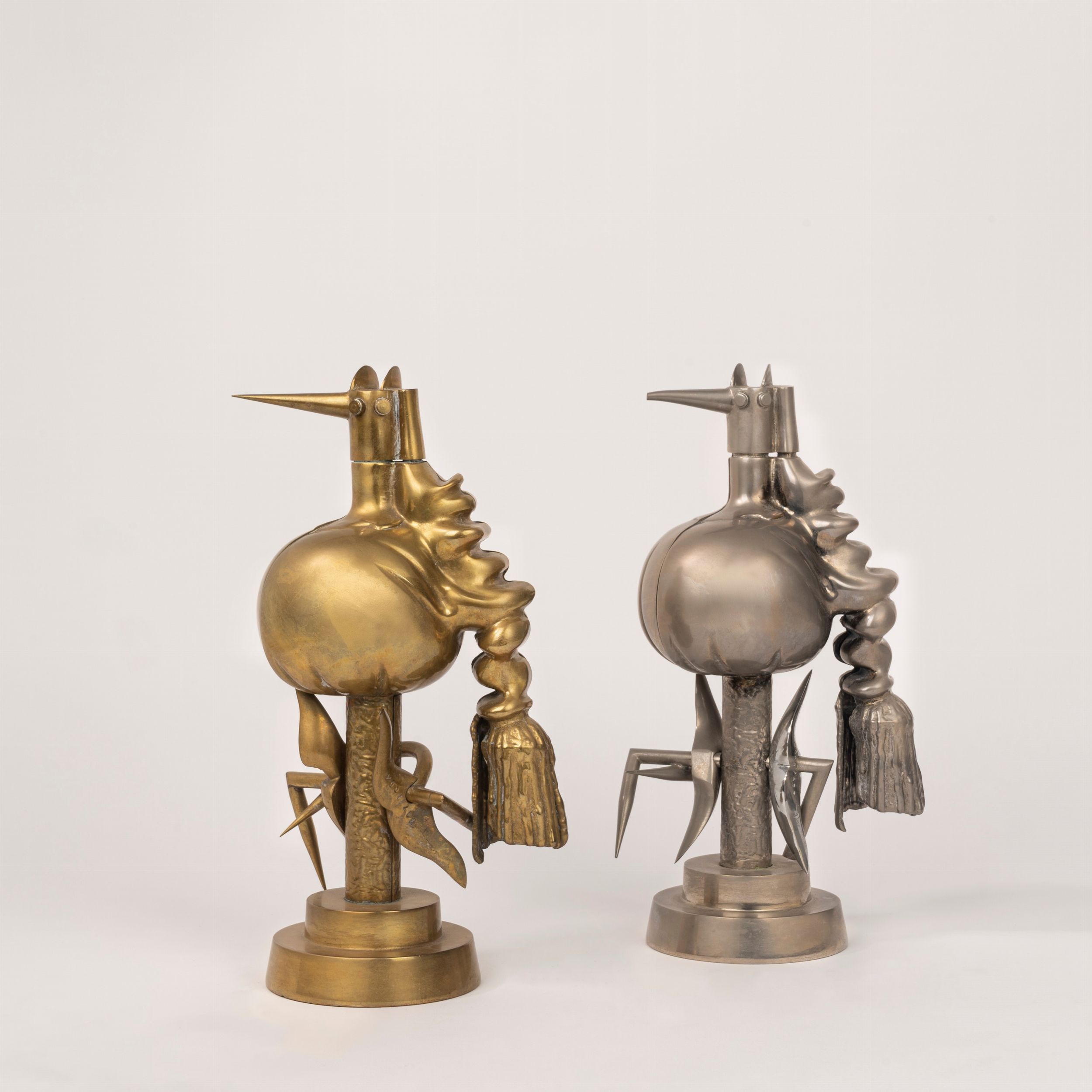 coppia di multipli in ottone dorato e in metallo cromato argentato, ess. 367/500A e 367/500B, cm 26,5 x 14 x 8,5
