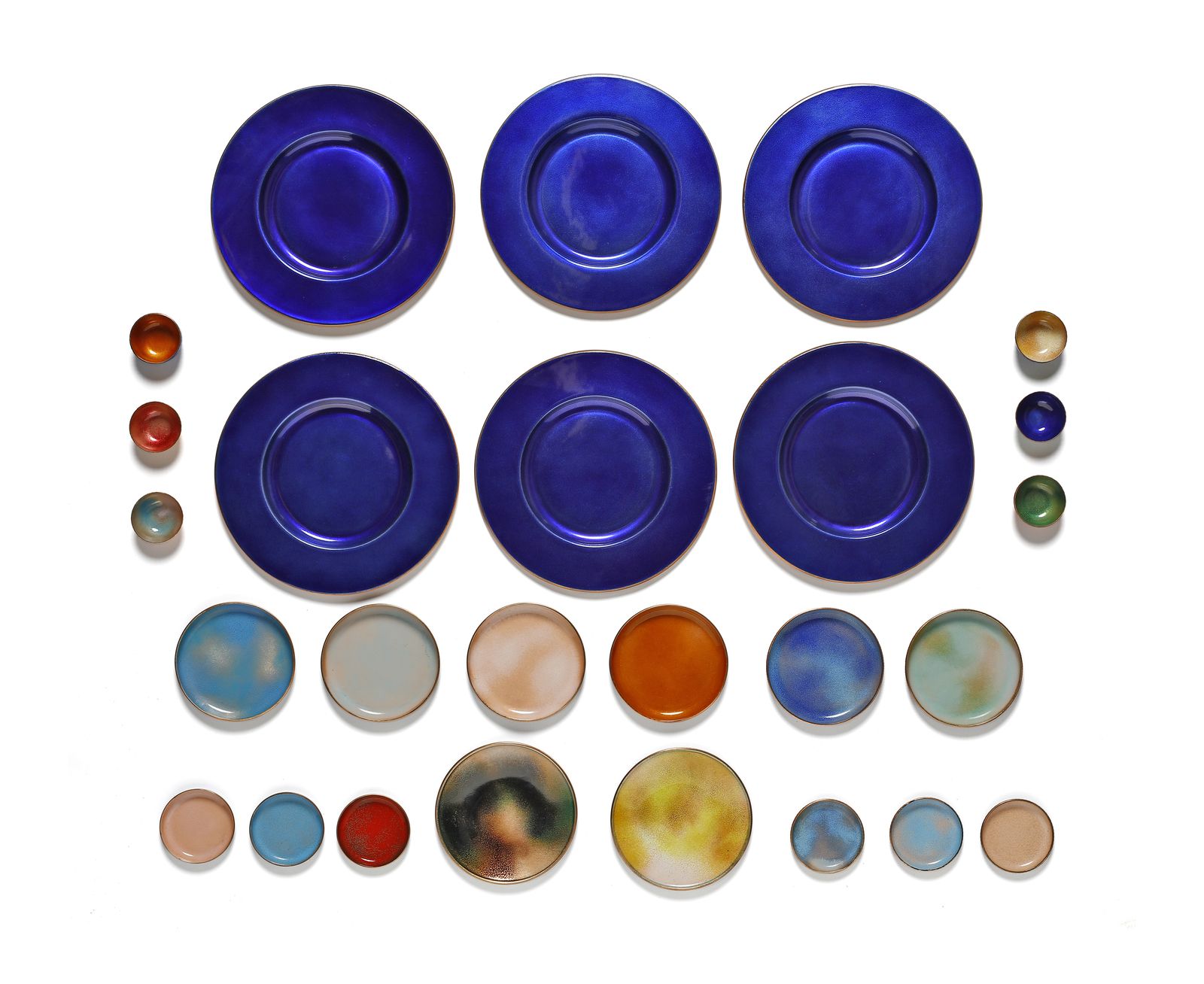 Anni Cinquanta / Sessanta.Firmati.Dimensioni: piatto pane 14,5 cm. sottobicchieri 9 cm. portaburro 3 x 6 cm. sottobottiglia 17,5 cm
