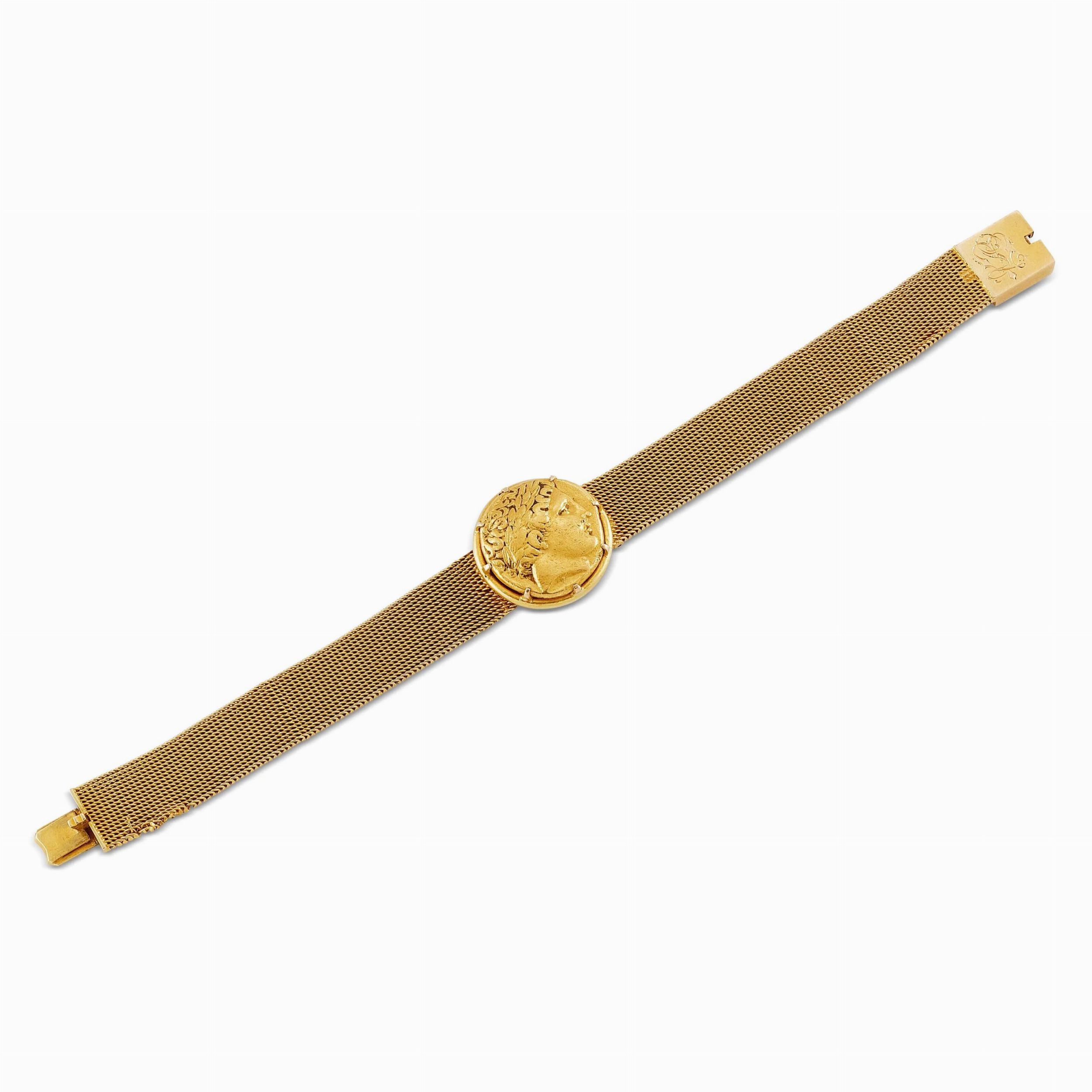 BRACCIALE CON MONETA in oro giallo 18kt, realizzato a fascia morbida, con al centro una riproduzione della moneta del re Filippo II di Macedonia, raffigurate sul diritto la testa di Apollo e sul rovescio una biga in corsa e il nome del sovrano in greco antico al genitivo: ΦΙΛΙΠΠΟΥ (moneta di Filippo), lungh. cm 15,5, gr. 29