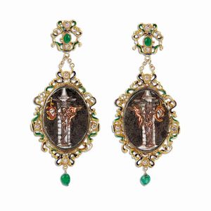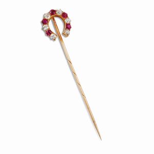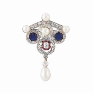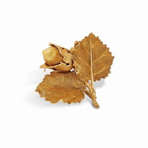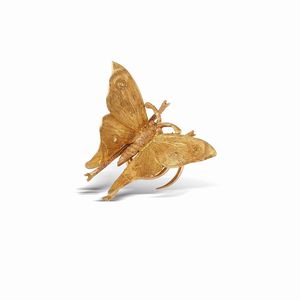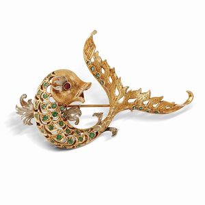 SPILLA A FORMA DI PESCE in oro giallo e bianco satinato 18kt, impreziosito da un rubino e smeraldi taglio rotondo [..]