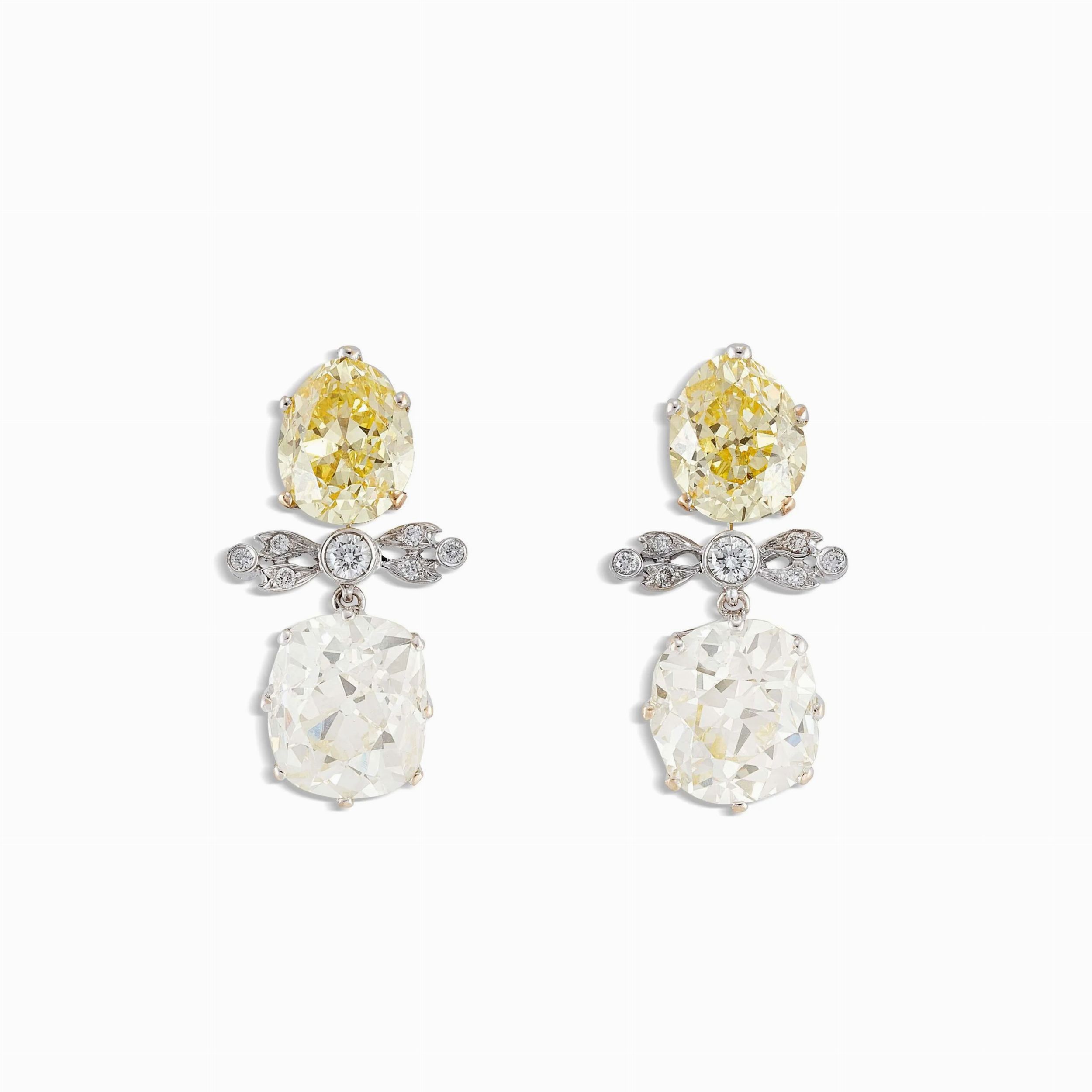 PAIO DI ORECCHINI PENDENTI CON DIAMANTI FANCY INTENSE YELLOW E DIAMANTI TAGLIO ANTICO in oro bianco 18kt, impreziositi da da due diamanti fancy taglio a goccia di ct 3.74 e 3.69, e due diamanti pendenti taglio cuscino antico di ct 6.65 e 7.09, chiusura a clip, dim. cm 1x2,5, gr. 12 complessivi. Corredati di certificati IGN del 17/10/2024 attestanti le caratteristiche.