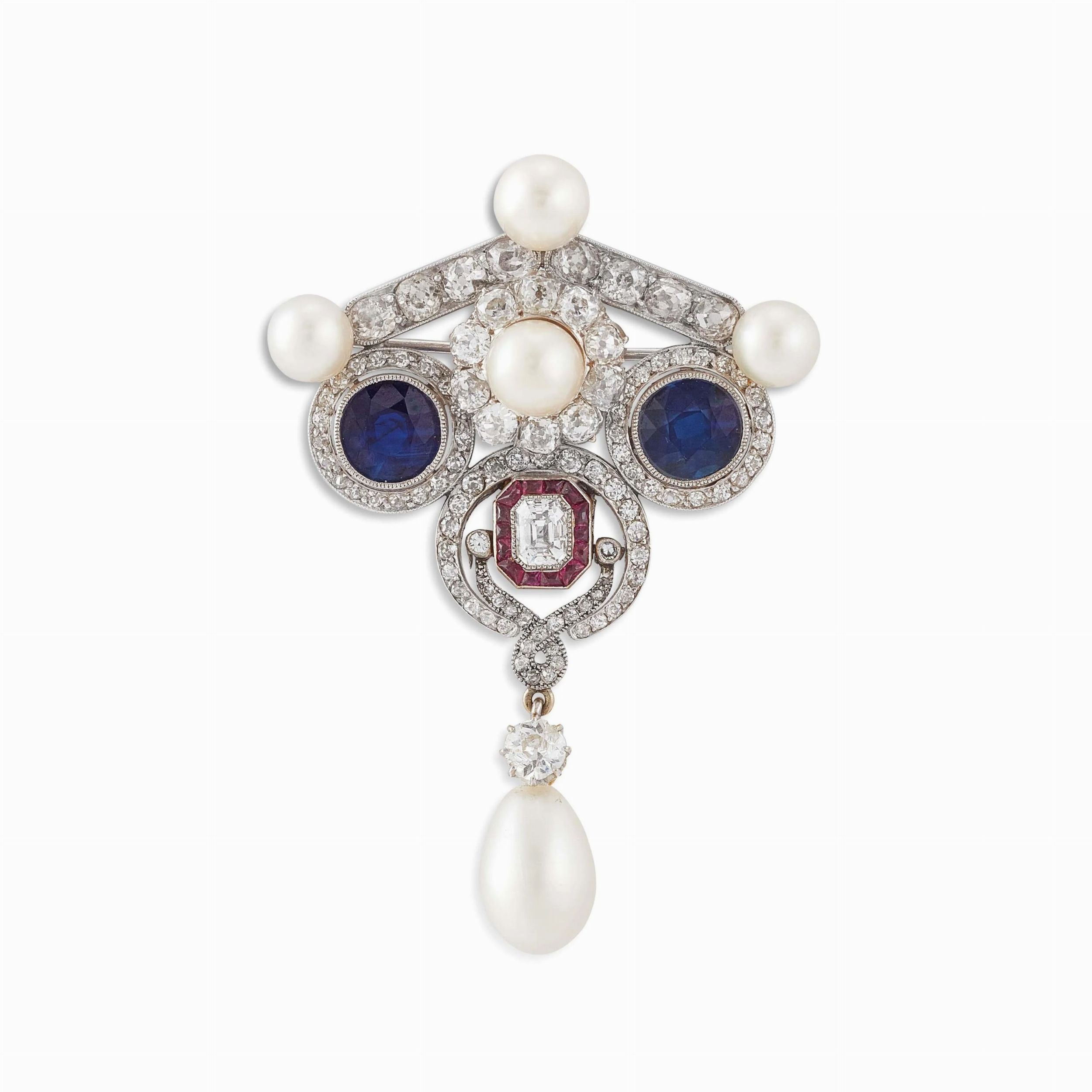 SPILLA CON PERLE NATURALI PIETRE DI COLORE E DIAMANTI