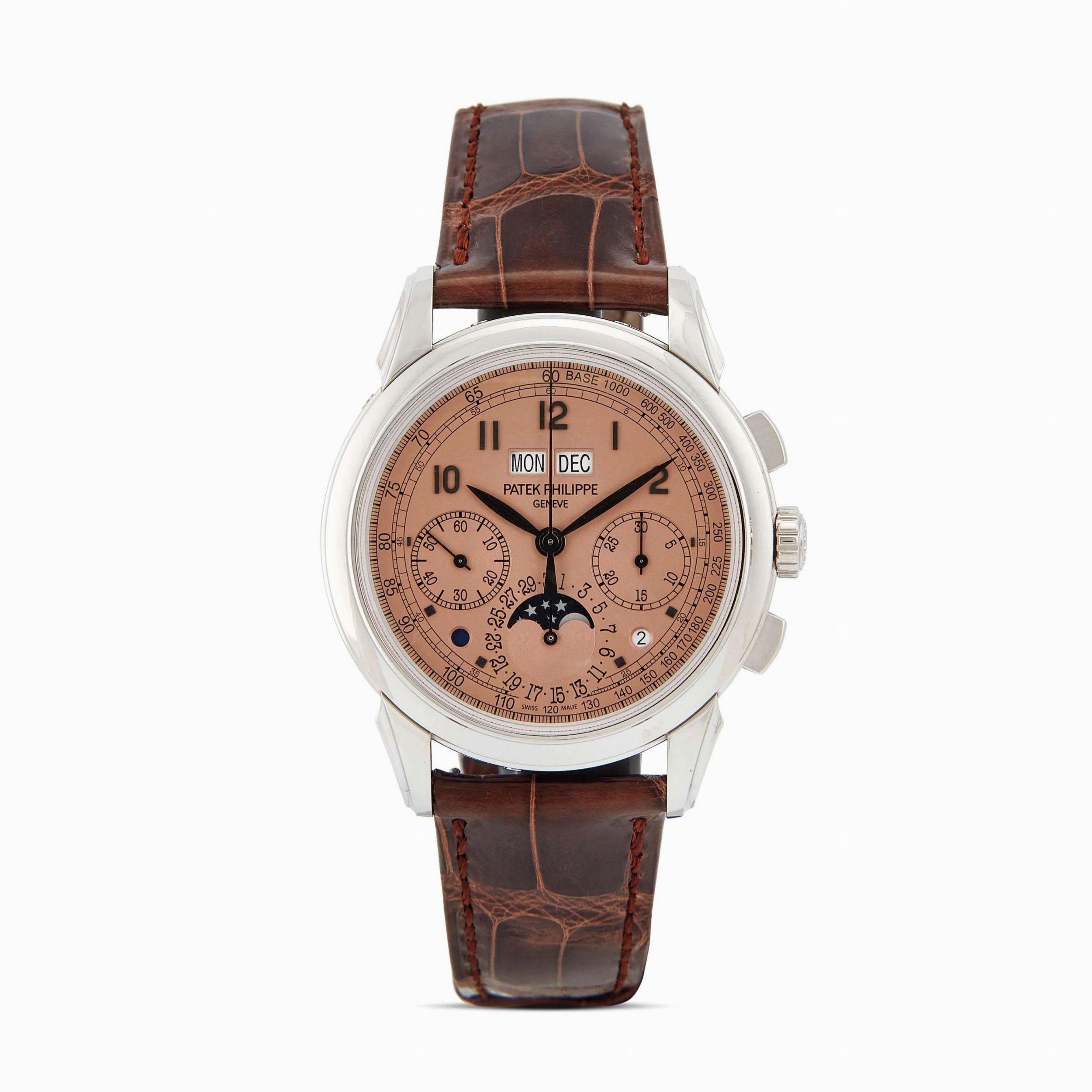 cassa in platino, fondello con movimento a vista, corona marcata, tasti del crono rettangolari, quadrante salmone, grafica nera, numeri arabi applicati, due contatori, scala tachimetrica, datario a doppia finestra a ore dodici, datario tra le quattro e le cinque, calendario perpetuo, fasi lunari, movimento a carica manuale cal CH 29-535 PS Q n. 7206308, cinturino originale in pelle marrone, fibbia deployant in platino marcata Patek Philippe, vetro minerale, gr. 134. Diam. mm 41
