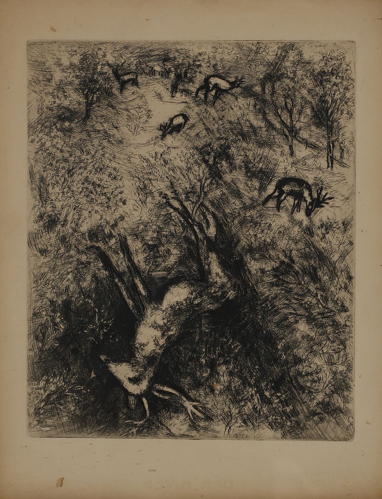 firma in lastra dimensioni lastra 29X24cm Editore:Tériade, Parigi.L'opera proviene dalla serie edita da Ambroise Vollard nel 1926 e successivamente riprese da Tériade, Paris, nel 1950. Questa incisione č inclusa nell'edizione in due volumi delle Favole, Fables, Eaux-fortes originales de Marc Chagall, pubblicata da Tériade nel Febbraio 1952.BIBLIOGRAFIAC. Sorlier, Marc Chagall et Ambroise Vollard, Editions Galerie Matignon, Paris 1981, Tav. 193 p. 116