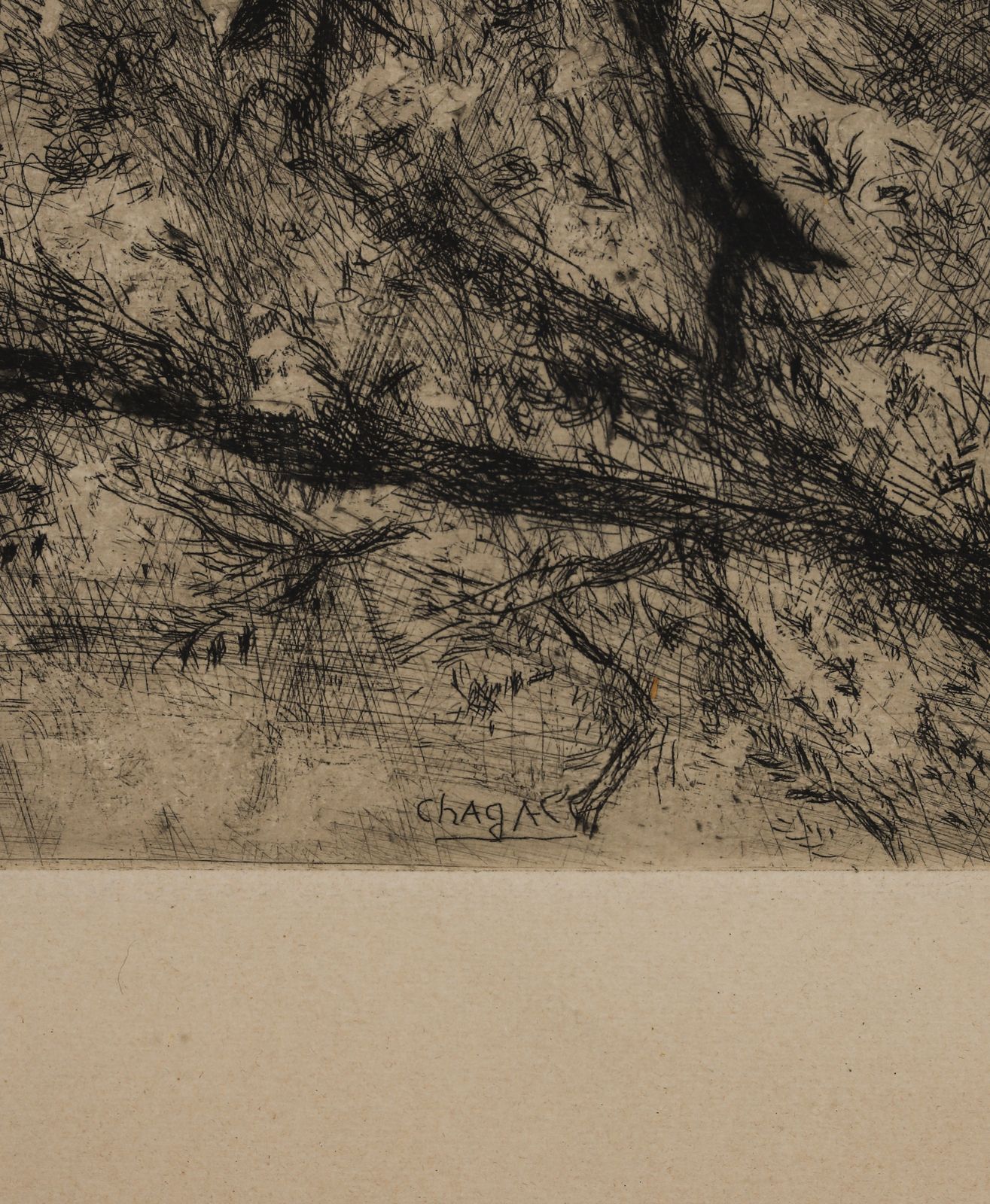 firma in lastra dimensioni lastra 29X24.5 cm Editore:Tériade, Parigi.L'opera proviene dalla serie edita da Ambroise Vollard nel 1926 e successivamente riprese da Tériade, Paris, nel 1950. Questa incisione č inclusa nell'edizione in due volumi delle Favole, Fables, Eaux-fortes originales de Marc Chagall, pubblicata da Tériade nel Febbraio 1952.BIBLIOGRAFIAC. Sorlier, Marc Chagall et Ambroise Vollard, Editions Galerie Matignon, Paris 1981, Tav. 195 p. 116