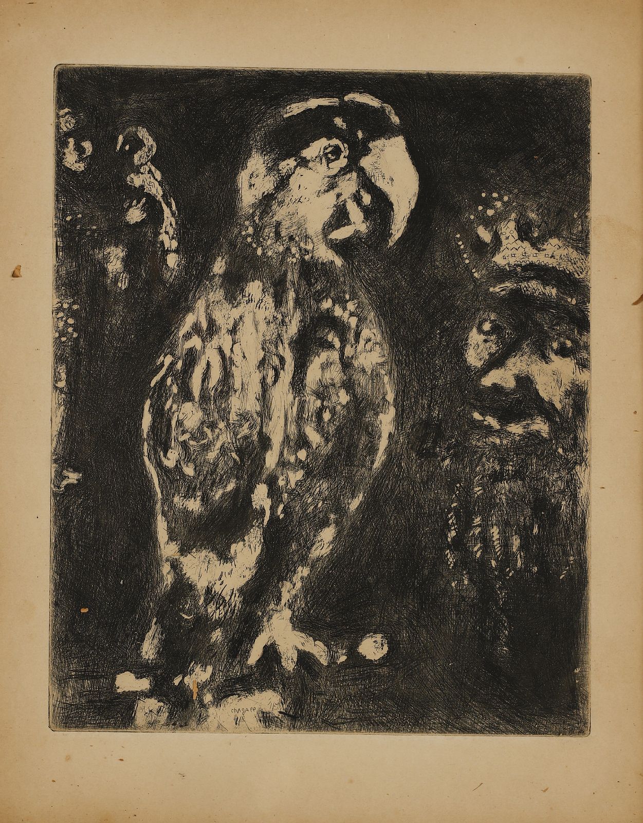 firma in lastra dimensioni lastra 38,5x30cm Editore:Tériade, Parigi.L'opera proviene dalla serie edita da Ambroise Vollard nel 1926 e successivamente riprese da Tériade, Paris, nel 1950. Questa incisione č inclusa nell'edizione in due volumi delle Favole, Fables, Eaux-fortes originales de Marc Chagall, pubblicata da Tériade nel Febbraio 1952.BIBLIOGRAFIAC. Sorlier, Marc Chagall et Ambroise Vollard, Editions Galerie Matignon, Paris 1981, Tav. 190 p. 114