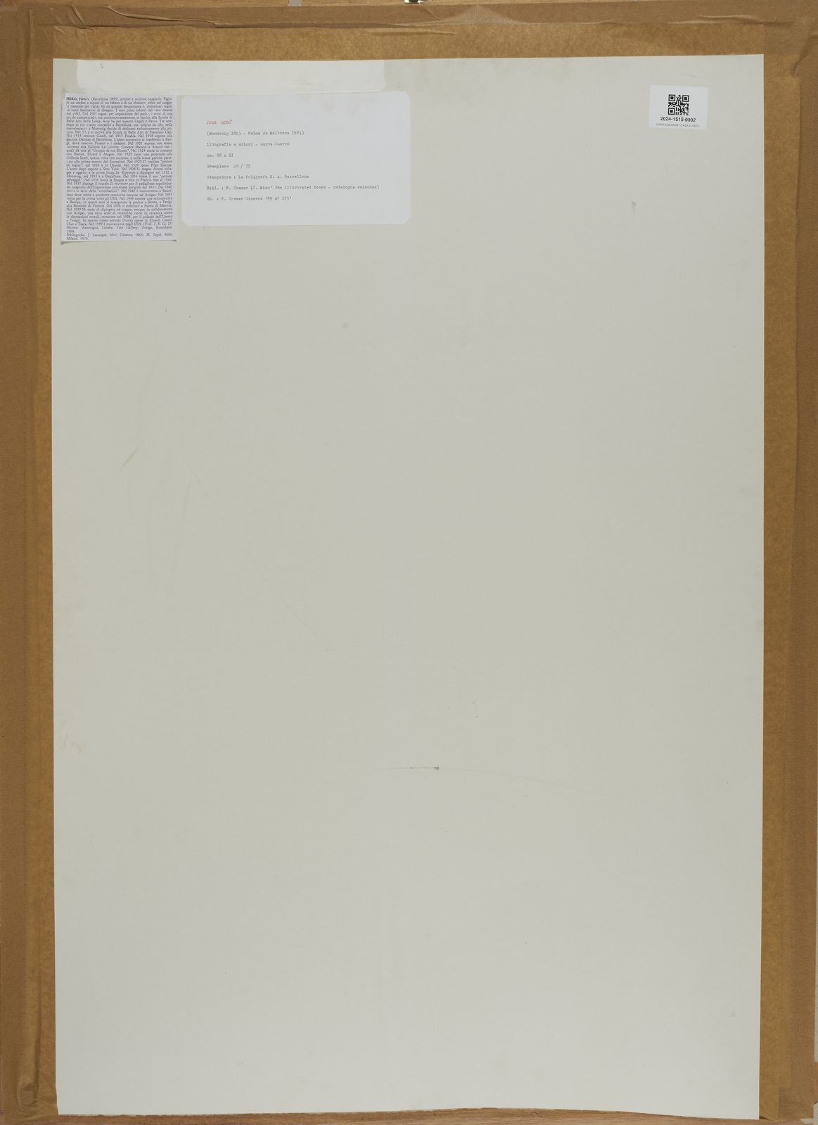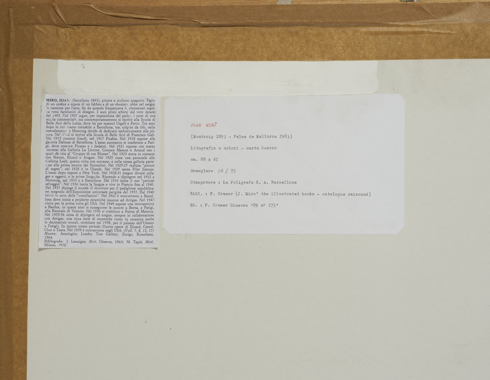 firma e tiratura a matita, es. 26/75filigrana Guarrostampatore: La Polígrafa, Barcellona.editore: La Polígrafa, Barcellona.BIBLOGRAFIAPatrick Cramer, Joan Miró Litografo, V. 1972-1975, Maeght Éditeur, Paris, 1992, n.175PROVENIENZAGalleria Arte PaceCollezione privata, Milano