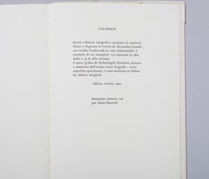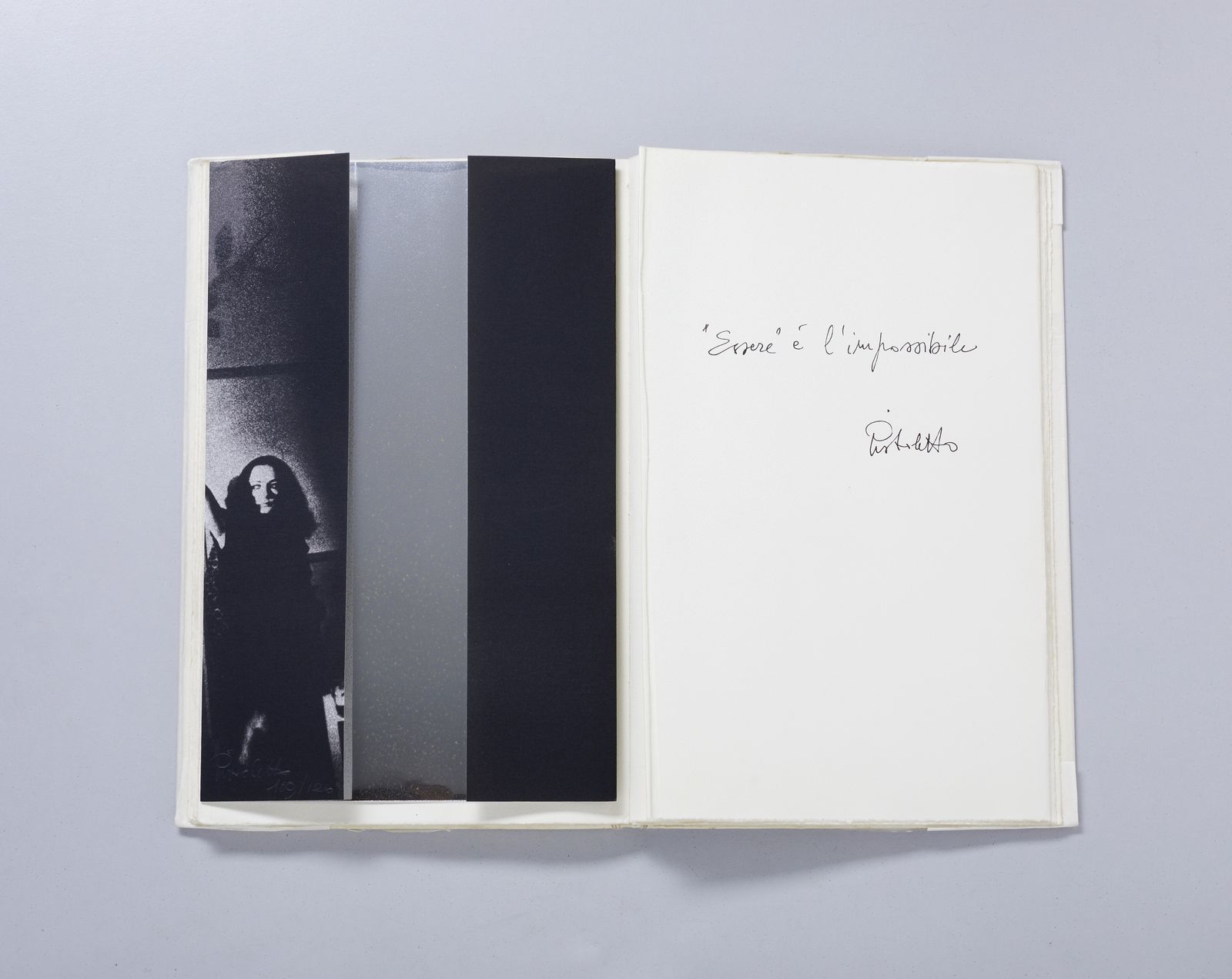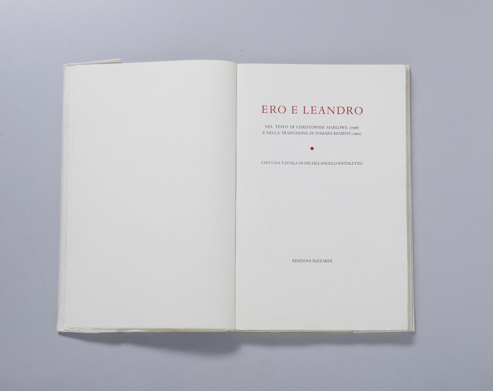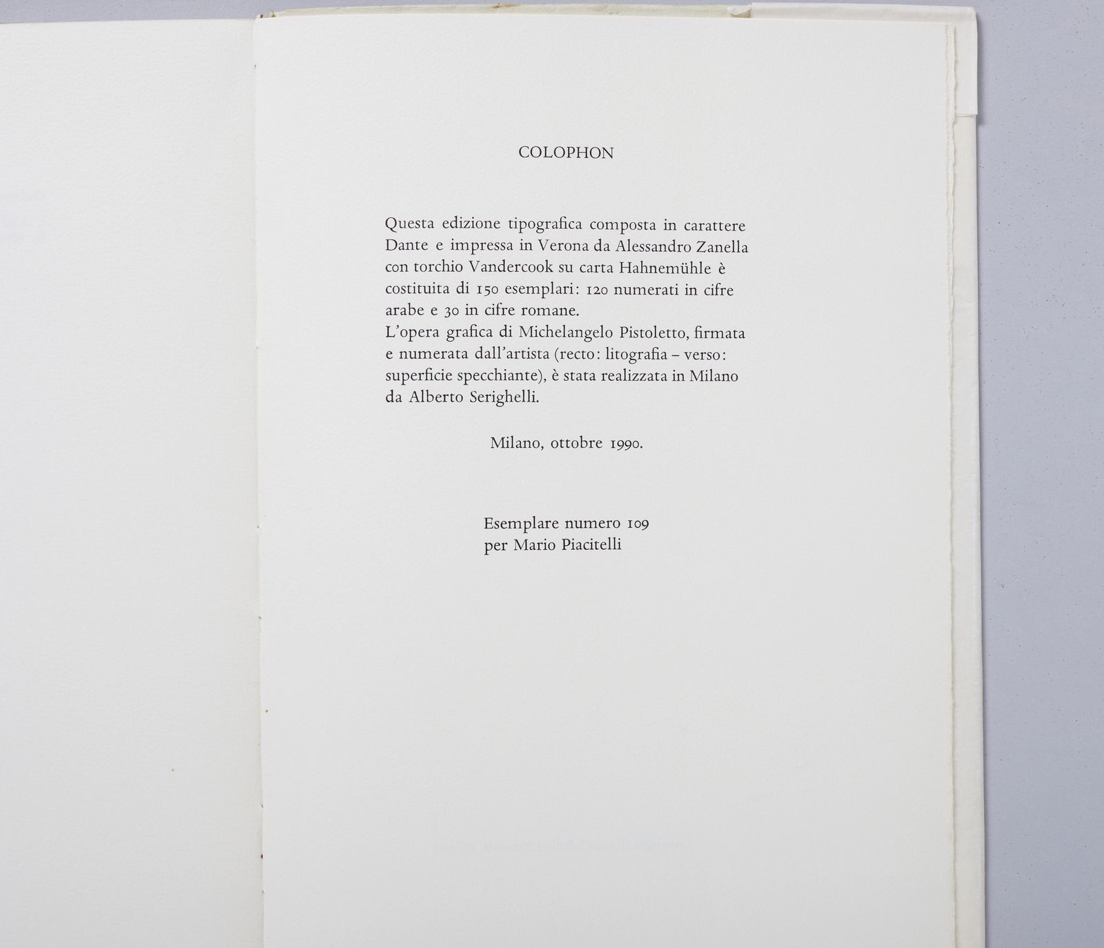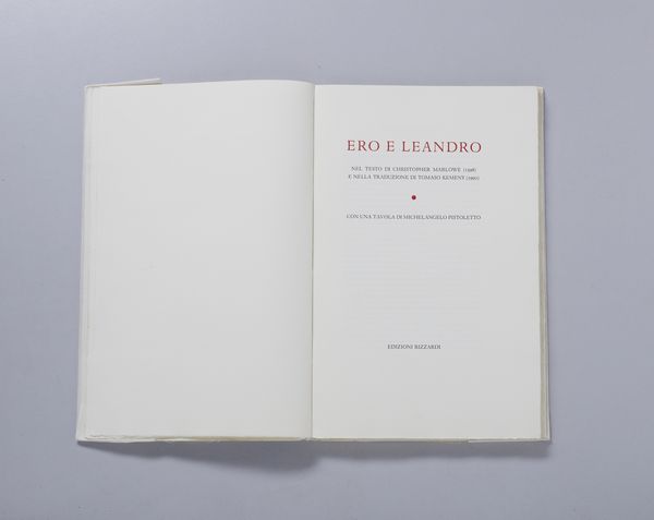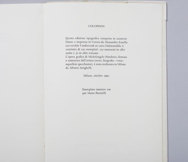 firma e tiratura a matita, es.109/120 la grafica è contenuta all'interno del poemetto in esametri di Christopher Marlowe, Ero e Leandro, Edizioni Rizzardi, arte e cultura, Milano 1990 esemplare n.109 realizzato per Mario PiacitelliNel marzo del 1970, alla galleria dell'Ariete di Milano, Maria e Michelangelo furono ritratti da un'istantanea di Ugo Mulas durante la performance di presentazione del libro L'uomo nero, il lato insopportabile per l'apertura della mostra Tutte le donne nata da un brano dello stesso libro. Nella scena colta dalla foto, Maria tiene in mano la lampada che, pari ad un faro nell'oscurità, illumina lo specchio in cui è immerso lo sguardo di Michelangelo mentre assiste all'atto di recisione, da parte di uno sconosciuto, della rosa che Maria gli aveva precedentemente offerto. nel 1998 quell'immagine diventa la copertina-involucro del volume che raccoglie gli scritti di Un artista in meno. Ora, nel 1990, essa entra in questa edizione dedicata a Ero e Leandro.(cit. Michelangelo Pistoletto, Cristopher Marlowe, Ero e Leandro, Edizioni Rizzardi, arte e cultura, Milano 1990, p. 9 )