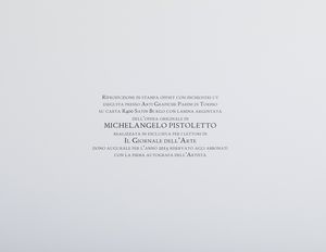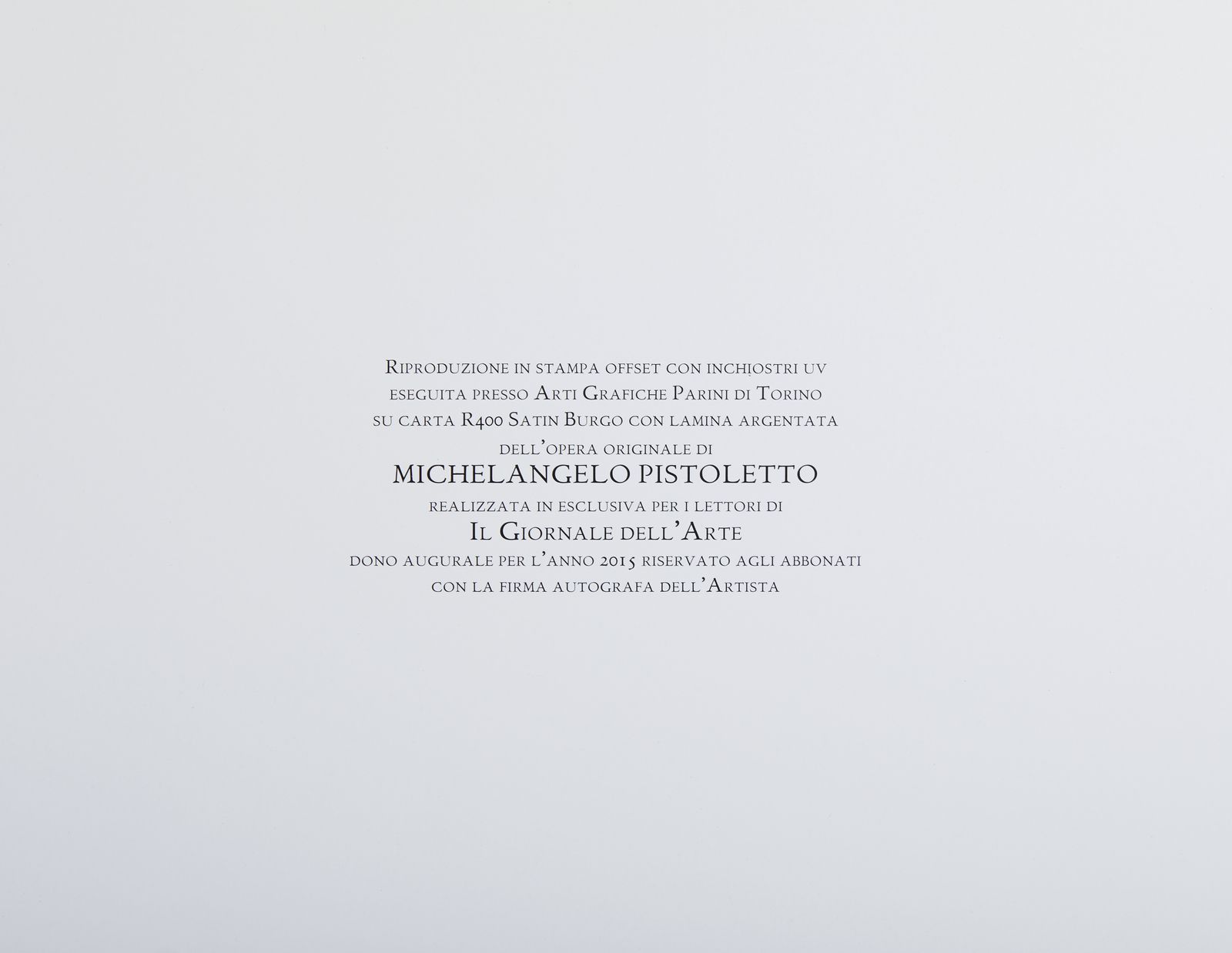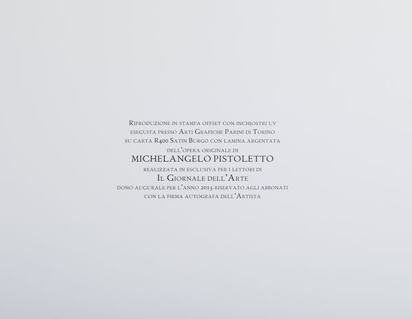 firmaedizione totale: 2000 esemplaril'opera è una riproduzione in stampa offset eseguita presso Arti grafiche Parini di Torino, su carta R400 Satin Burgo con lamina argentata dell'opera originale realizzata in esclusiva per i lettori abbonati di Il Giornale dell'Arte, 2015