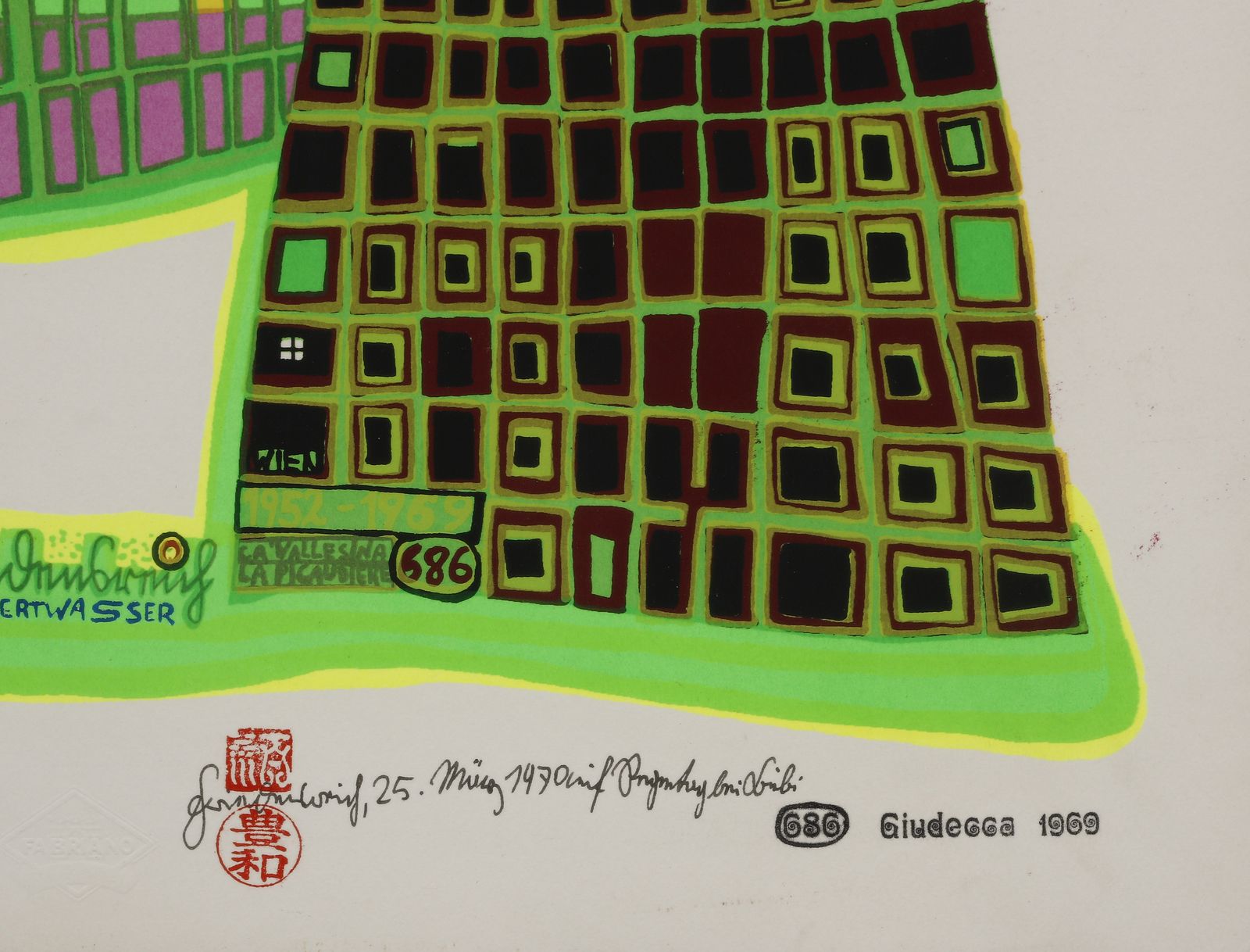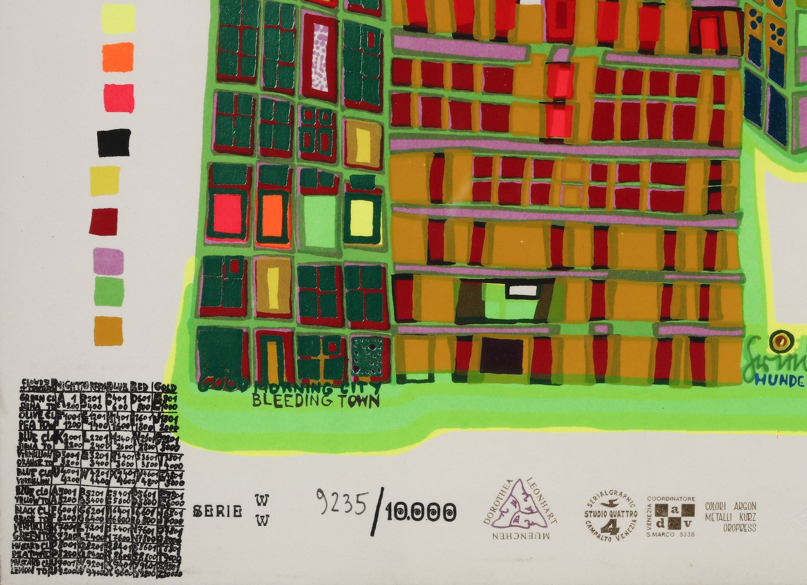 Serie HWG 42, es. 9235/10.000, firma, data, Giudecca 1969, timbro a secco Fabrianostampatore: Studio Quattro, Venezia - Campalto, 1969/70, in collaborazione con lo stampatore Lino CoinEDIZIONE TOTALEHWG 41a (edizione iniziale) 6.400HWG 41b (edizione iniziale) 1.600firmato e numerato 1-10000 (a mano)/10000 (meccanicamente)L'edizione totale di HWG 41 e HWG 42 è composta da 10.000 esemplari, suddiviso in tre edizioni:HWG 41a (edizione iniziale) 6.400HWG 41b (edizione iniziale) 1.600HWG 42 (edizione fosforescente) 2.000,firmato e numerato 1-10000 (a mano)/10000 (meccanicamente).SITOGRAFIAhttps://www.hundertwasser.com/en/original-graphic/686_hwg41_good_morning_city_2240Ringraziamo Archivio Hundertwasser per aver contribuito alla stesura della scheda