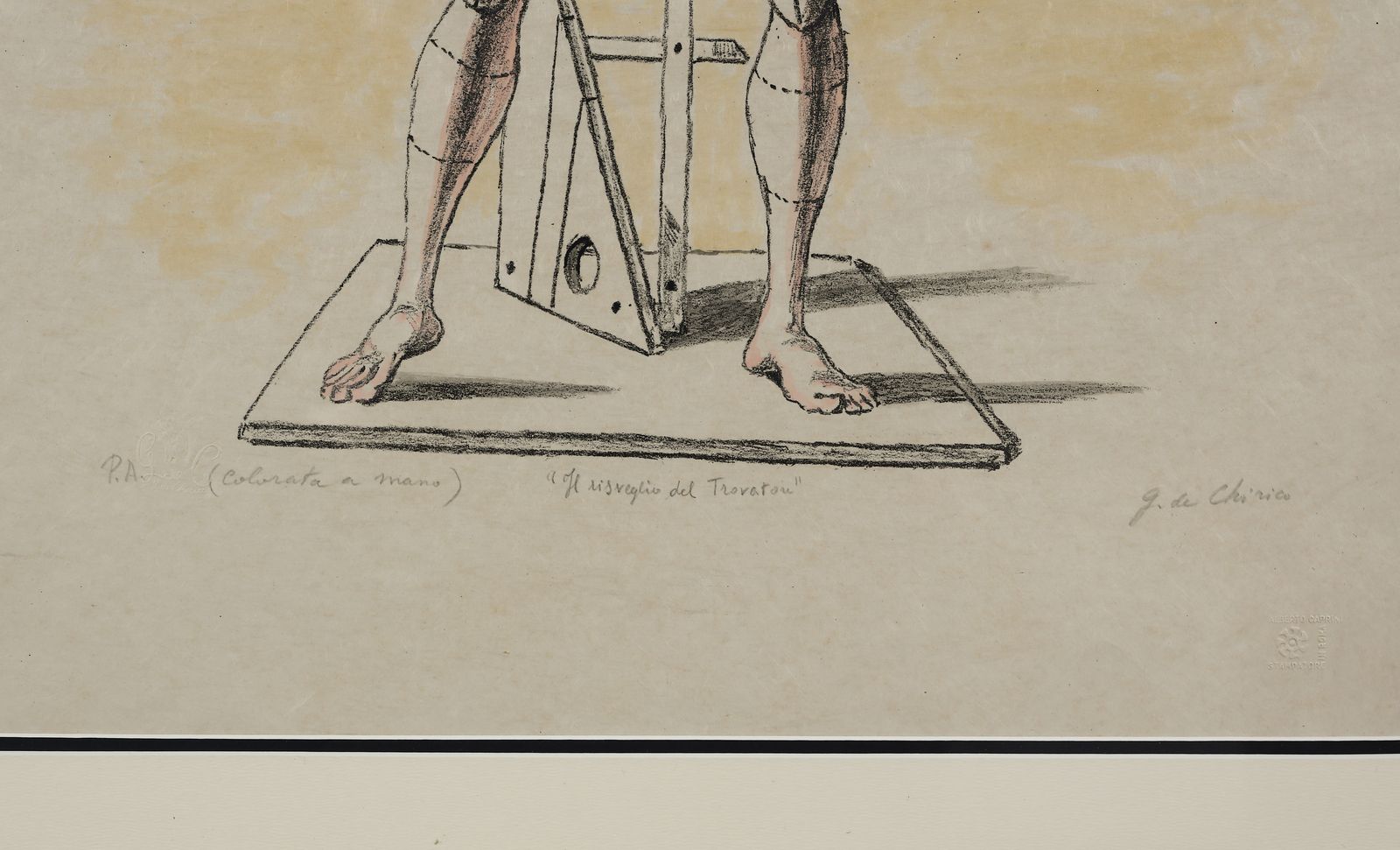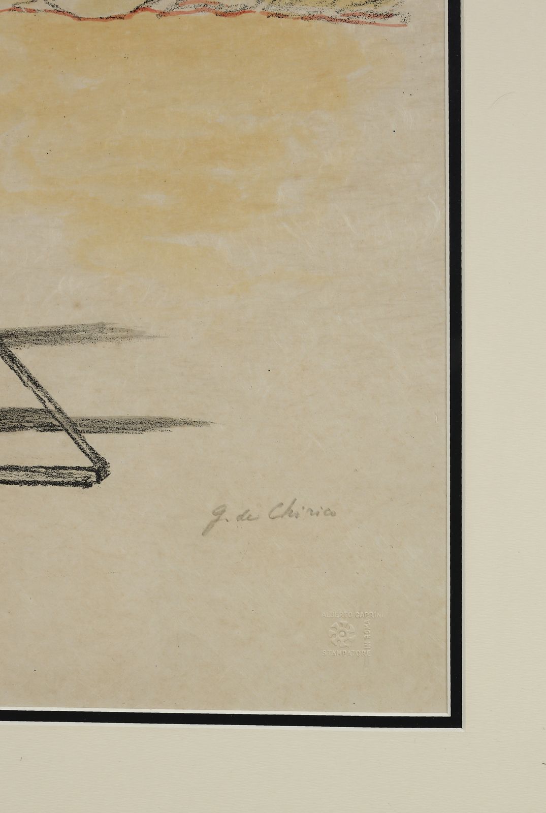firma, titolo e tiratura a matita, es. p.a.timbro a secco Giorgio De Chiricotimbro a secco Alberto Caprini Stampatore, RomaL'opera è accompagna da certificato di autenticità di Alberto Caprini Stampatore, Roma.EDIZIONE TOTALE99. XXXV esemplari. 21 esemplari siglati dalla A alla Z +15 p.d.a. + alcuni colorati a mano dall'artistaBIBLIOGRAFIAE. Brandani, Giorgio de Chirico. Catalogo dell'opera grafica 1969-1977, Ed. Bora, Bologna, 1990, n.179