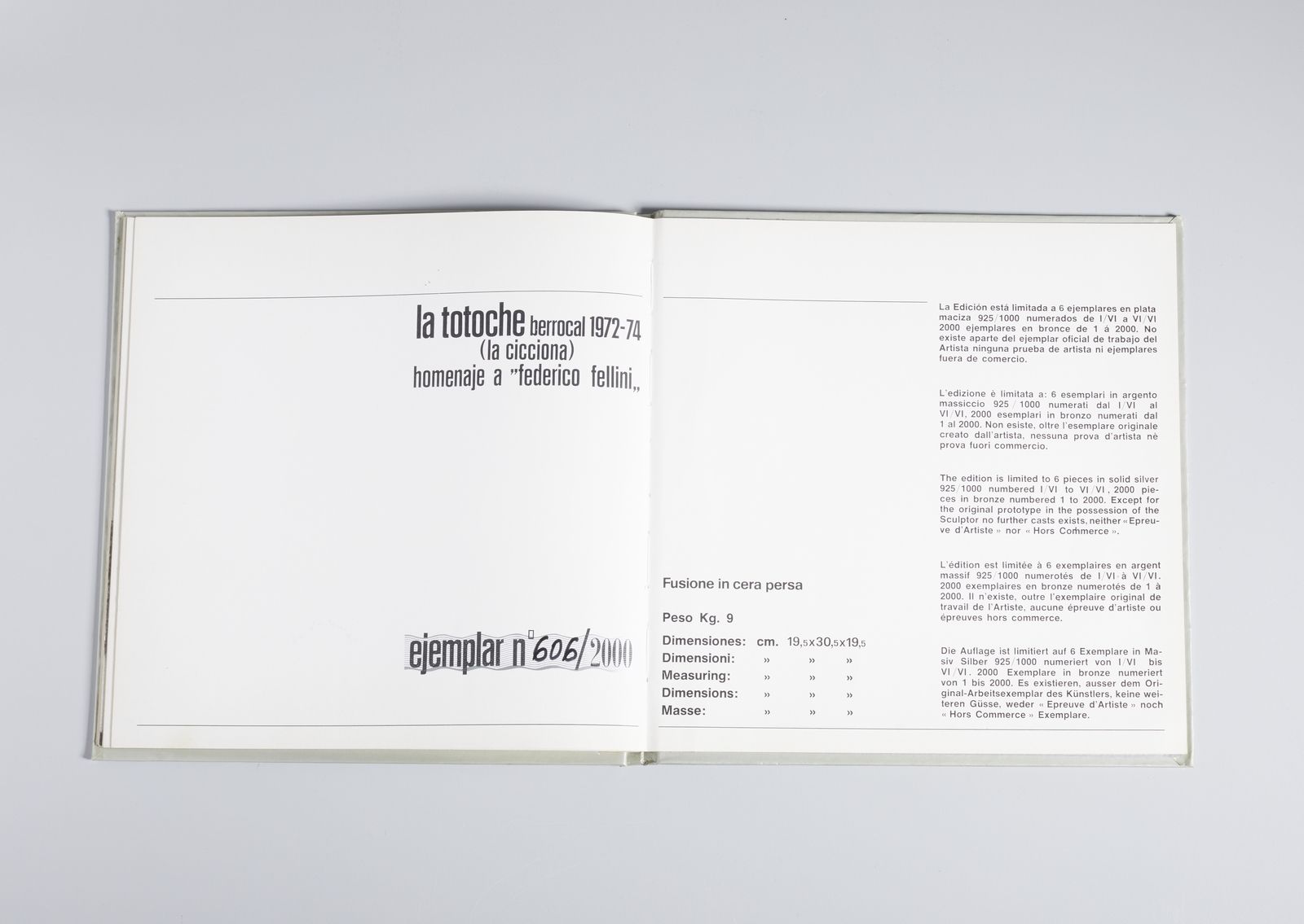 firma e tiratura incise, es. 606/2000.L'opera è corredata della sua scatola originale in pelle e del volume con le istruzioni di montaggio la totoche berrocal 1972-74 (la cicciona) homenaje a Federico Fellini EDIZIONE TOTALE6 esemplari in argento massiccio 925/1000 numerati dal I/VI al VI/VI, 2000 esemplari in bronzo numerati dal 1 al 2000. Non esiste oltre all'esemplare originale creato dall'artista, nessuna prova d'artista ne prova fuori commercio. PROVENIENZACollezione privata, Padova