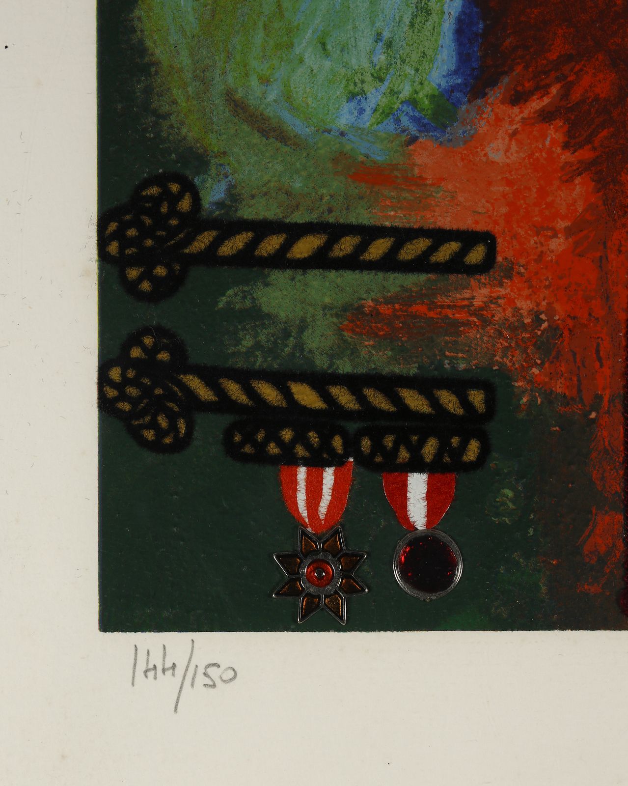 firma e tiratura a matita, es 144/150timbro a secco Mastrogiacomo Editore, Padovadimensione lastra 60x 75cmEDIZIONE TOTALE150 esemplari numerati da 1 a 150, 50 esemplari numerati da I a LBIBLIOGRAFIAE.Crispolti, Baj Catalogo generale delle stampe originali, Electa Milan 1986 n. 636 p. 162Si ringrazia Roberta Cerini Baj per aver contribuito alla stesura della scheda.